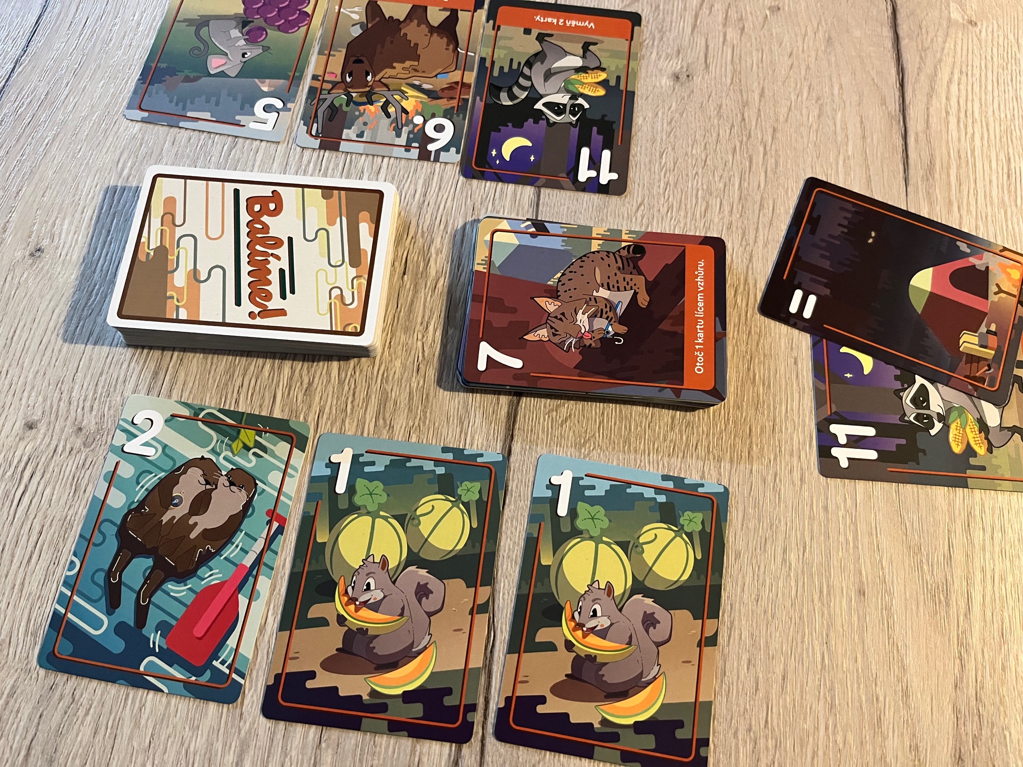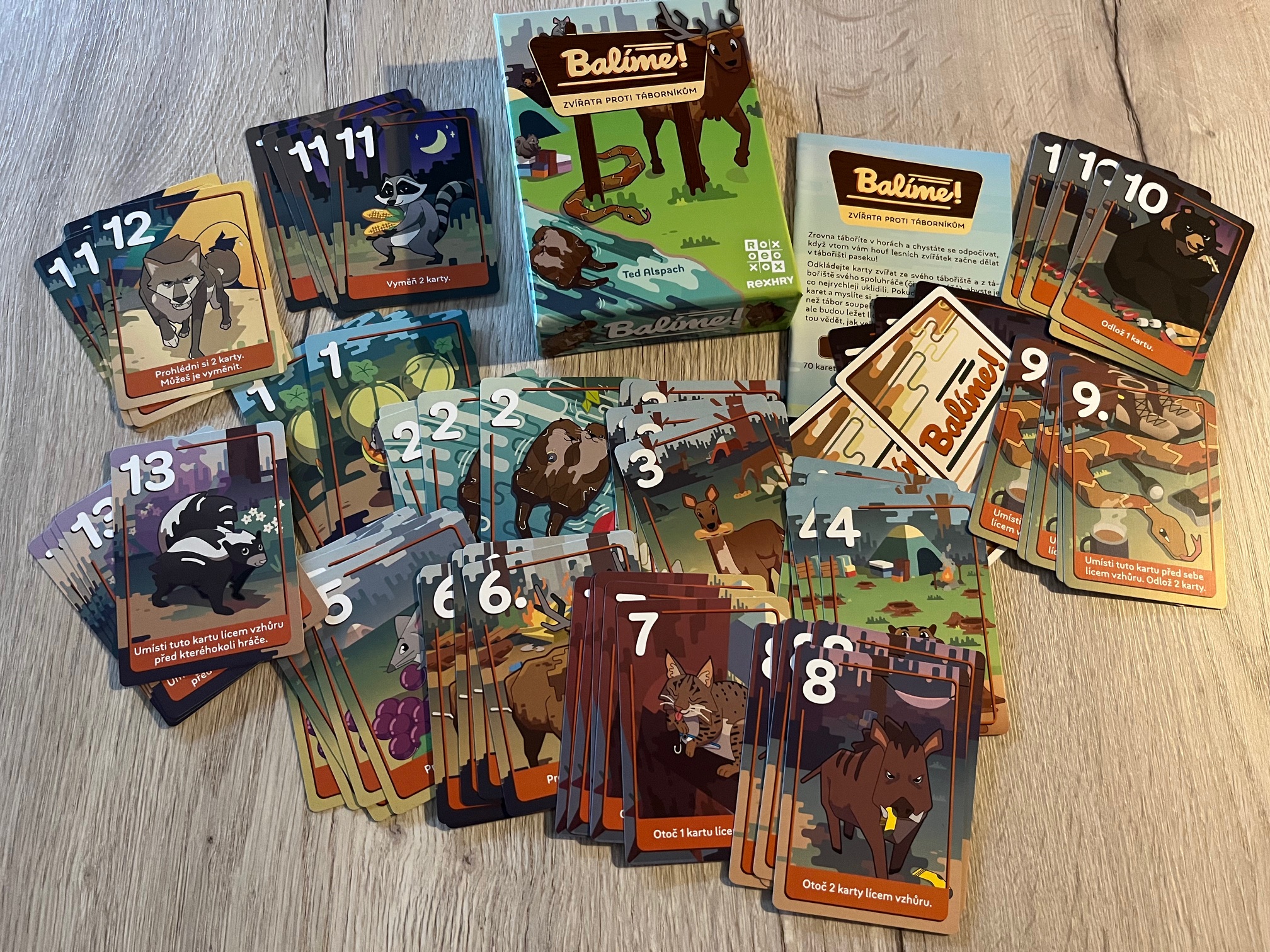 Balíme! je už na první pohled strašně milá a roztomilá hra. Sám autor spolu s Agusem Muqithem vytvořili kouzelný zvířecí svět. Celá hra je složena ze 70 karet po 5 zvířatech očíslovaných od 1 do 13, přičemž každá hodnota je jiný tvor a případně nese i odlišnou schopnost a k tomu 5 speciálních karet stanů/táborů s rovnítkem. Vše je hezky barevné, přehledné, jasné a jak už jsem psal „milé“ od vydry, přes vlka, až po myšku.