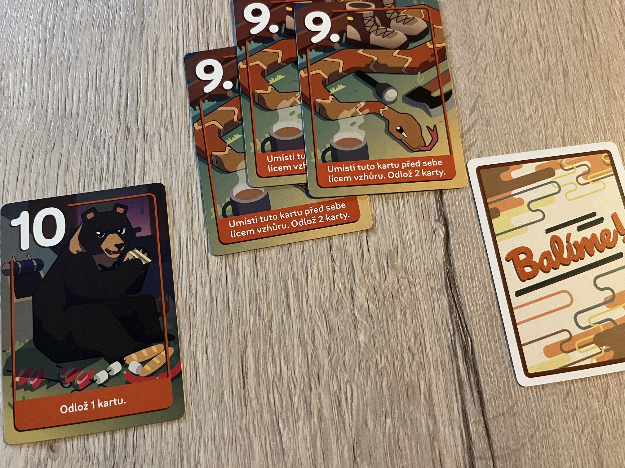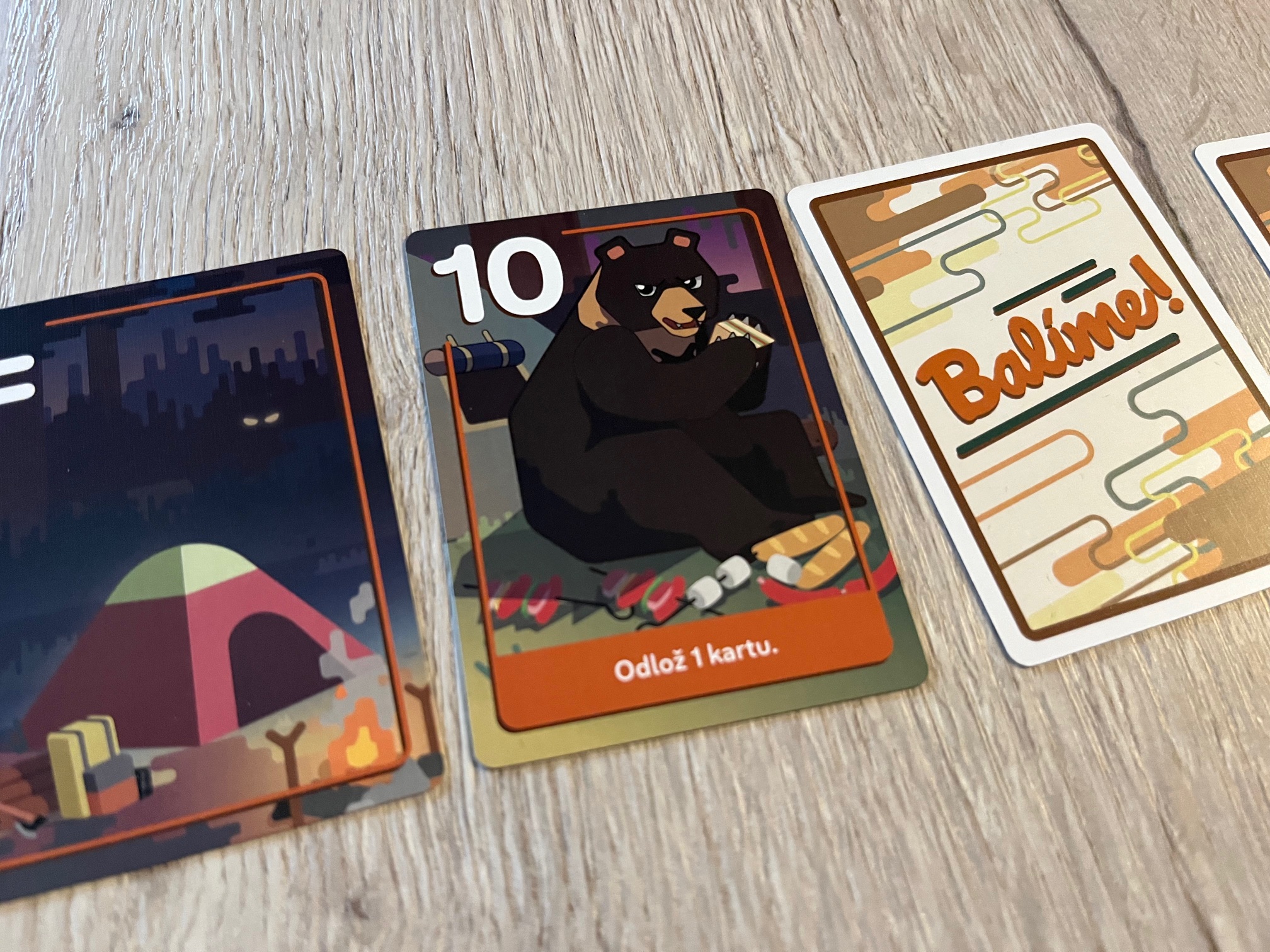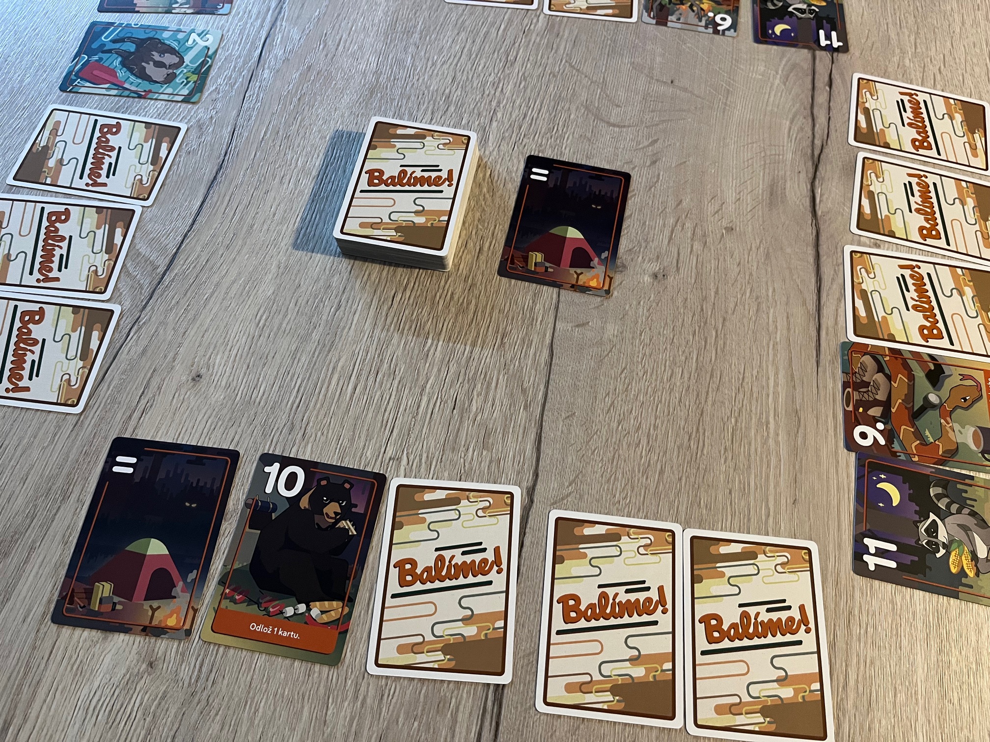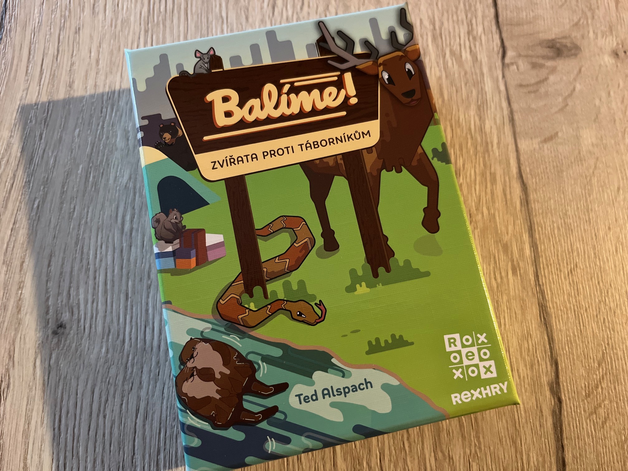 Balíme! je karetní paměťová hra Teda Alspacha pro 3-6 hráčů od 15 let (ne, věkové doporučení hry jsem absolutně nepochopil, protože reálně se pohybujeme spíš kolem 8+) a s herní dobou okolo 30 min na jednu kompletní partii. Hráči se převtělí do týmových táborníků, kteří se chtěli uložit k odpočinku a spánku, ale do věcí a tábora jim naskákala hromada lesních zvířat, kterých je potřeba se zbavit, a to pomocí paměti a hraní a využívání karet.