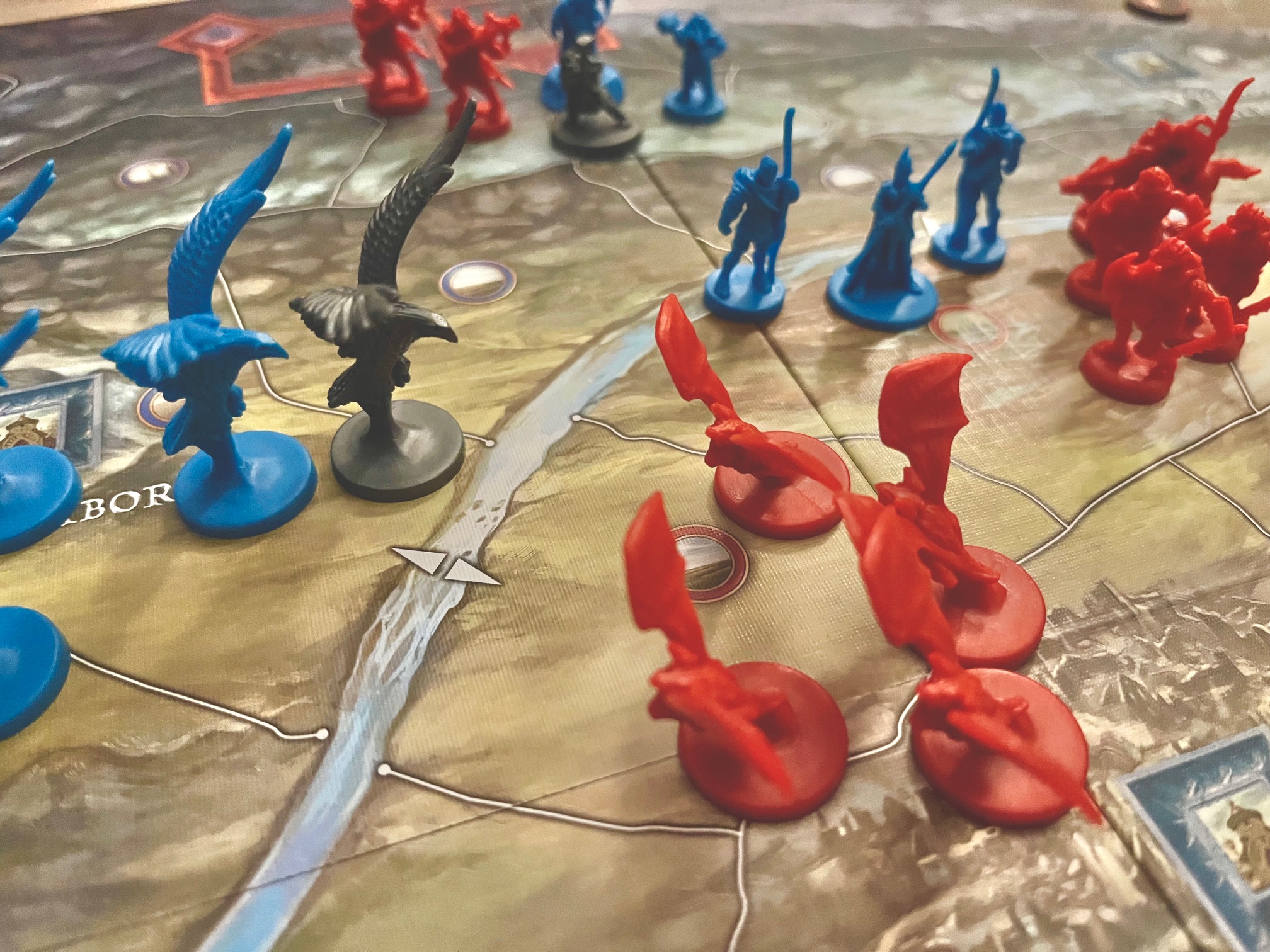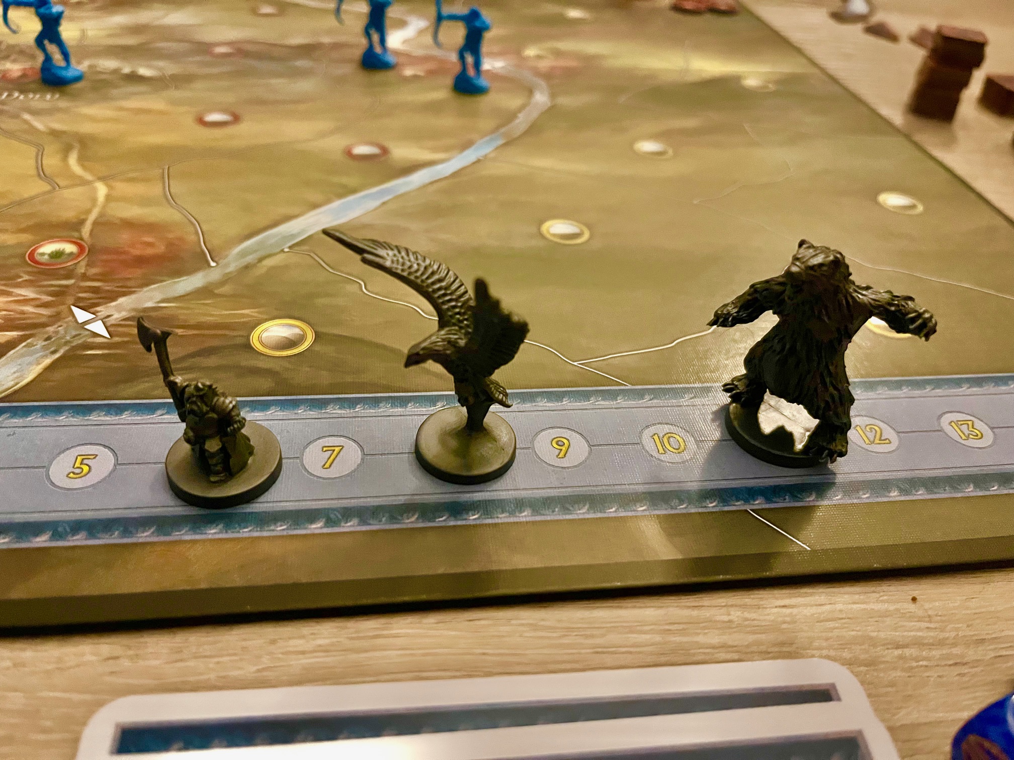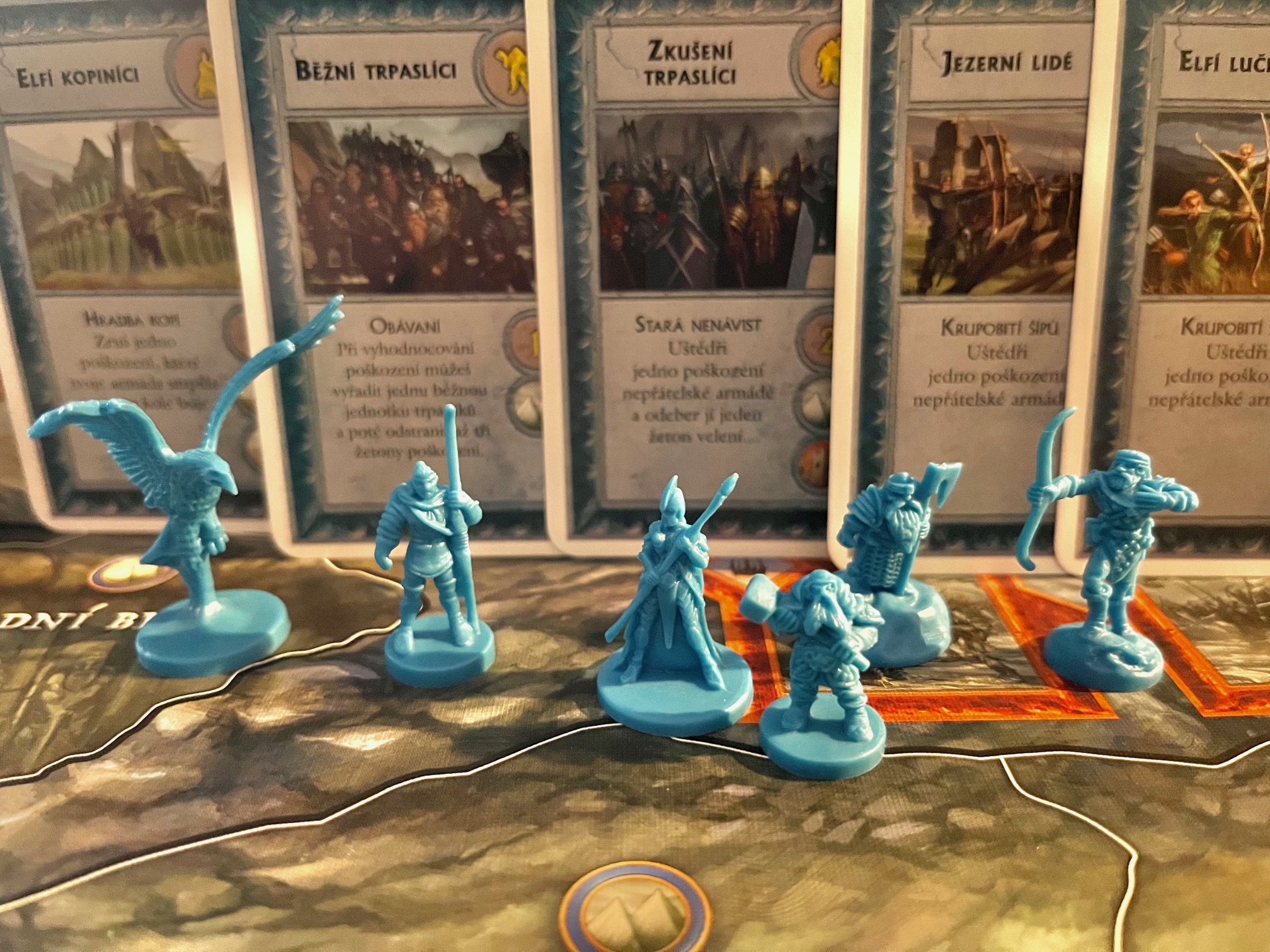 Ano, krabice se hrou je stejně velká jako třeba u zmíněné Války o prsten a možná by mohla být o kus nižší, ale hře to přidává na epičnosti. Pod víkem na vás čeká velký herní plán zobrazující Osamělou hory a její blízké okolí, ve kterém se odehrávala knižní bitva, a k němu pak desítky žetonů mnoha typů, desítky karet mnoha typů, ale i kostek, ať už speciálních či klasických šestistěnných a hlavně více než 100 herních figurek. Mezi nimi najdete jak hlavní postavy příběhu a bitvy, jakými jsou Gandald, Medděd, Bilbo nebo Dáin, ale i Bolg a k nim řady běžných vojenských sil obou stran zobrazující všechny národy účastníci se střetu. Za mě osobně je kvalita figurek pěkná – plast je dostatečně pevný, jednotlivé modely pěkně vytvořené. Některé vycházejí z původní Války o prsten (skřeti, elfští lučištníci nebo orli), ale některé jsou úplně nové jako skřetí průzkumníci s kuší, vrrci či elfí kopiníci. Za mě je, s ohledem na množství, kvalitu figurek opravdu pěkná a osobně přemýšlím, že vytvořím pomocí základních barev nějaké rozlišení v kombinaci s žetony posil, které mj. určují, jaké jednotky se dostanou na plán.
