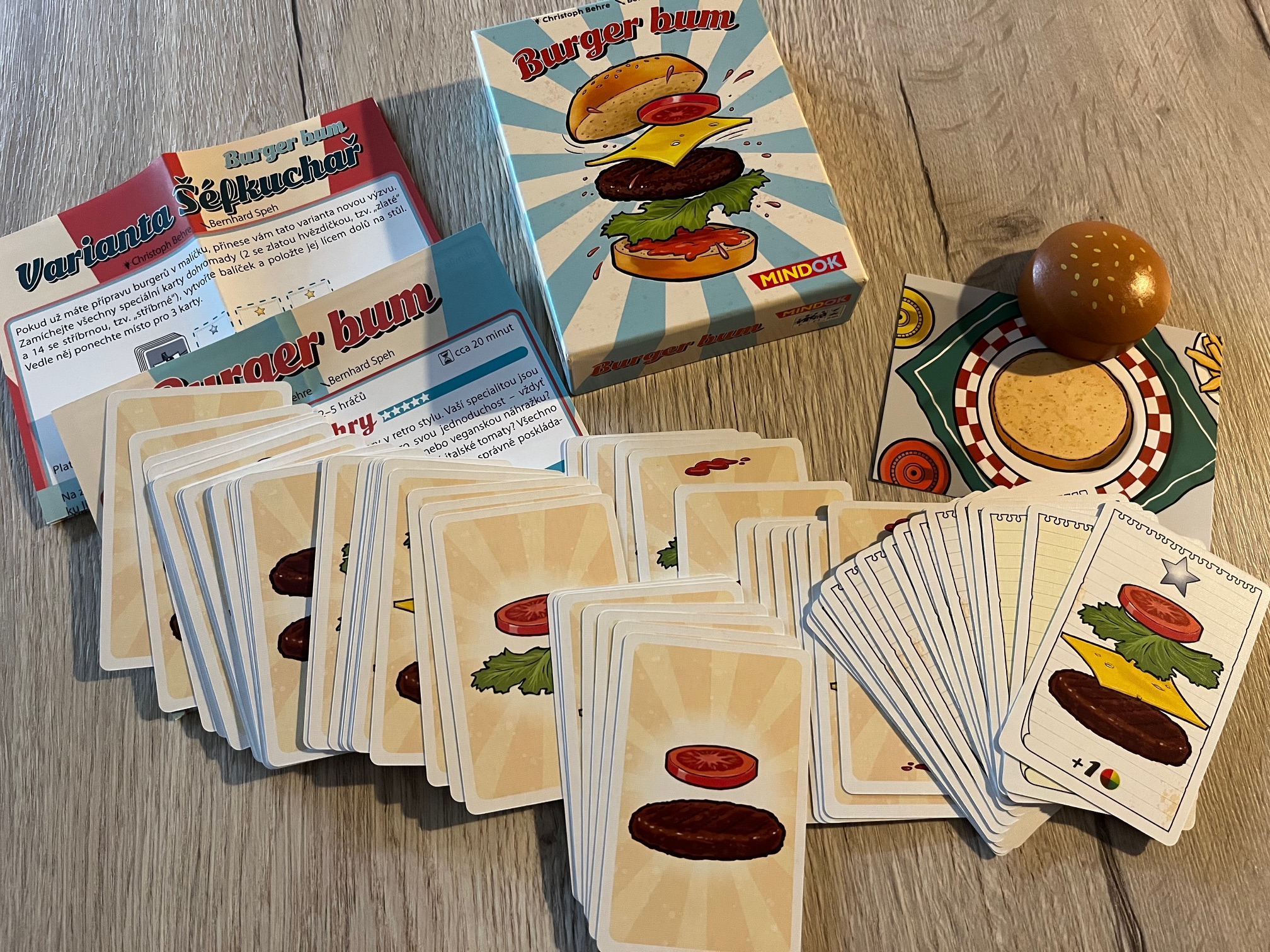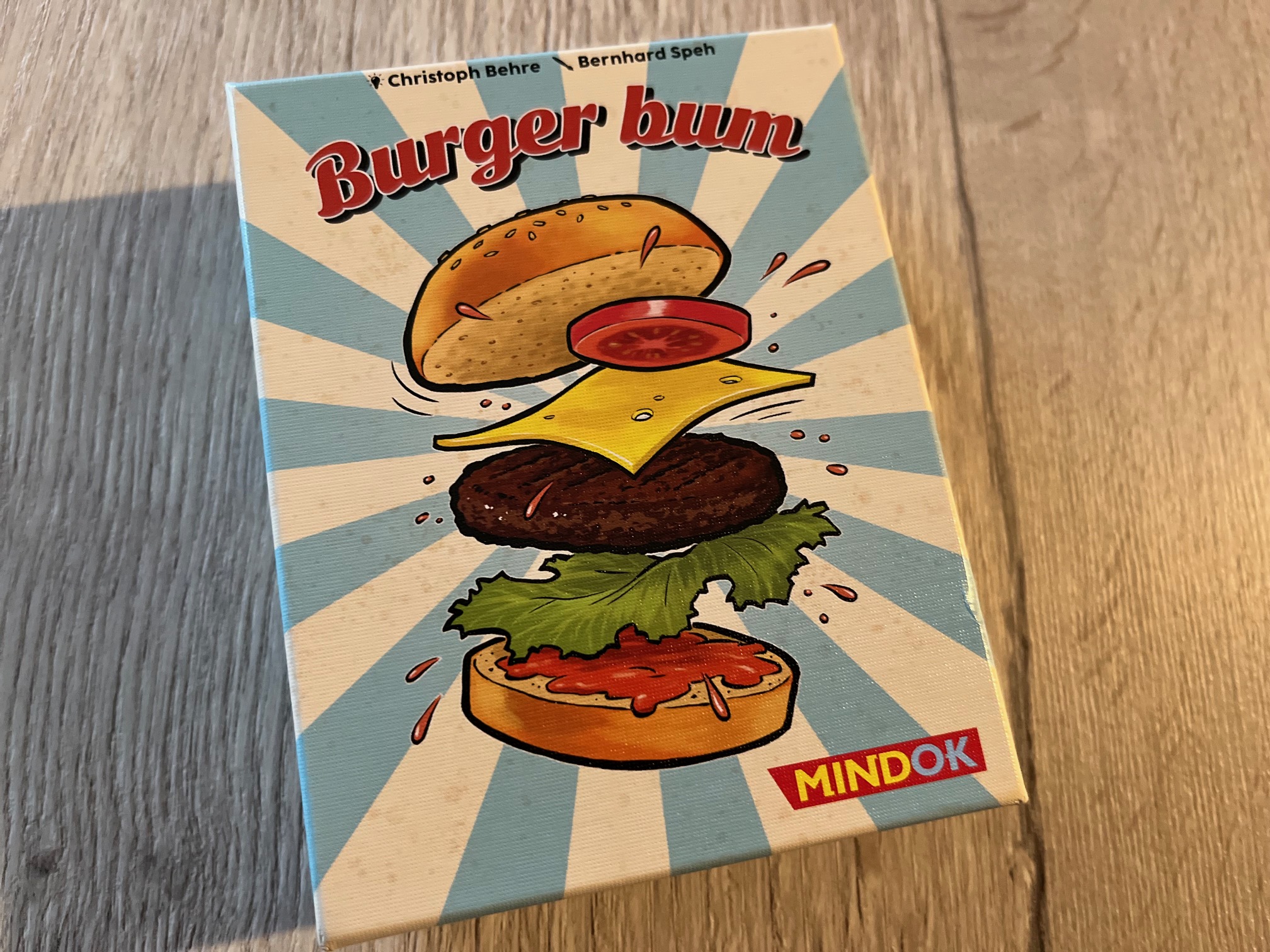 Když popis hry začíná spojením rychlého občerstvení a vytvářením pořádných burgerů a to pod značkou vydavatelství Mindok, asi leckomu vyskočí hutné strategické euro Králové rychlého občerstvení. No a o něm to dnes ani zdaleka nebude. Naopak dnešní burgerové menu servíruje kombinaci karetní hry postřehové s rychlou reakcí. Inu přivítejte Burger Bum, za kterým v původním originále stojí Amigo.
