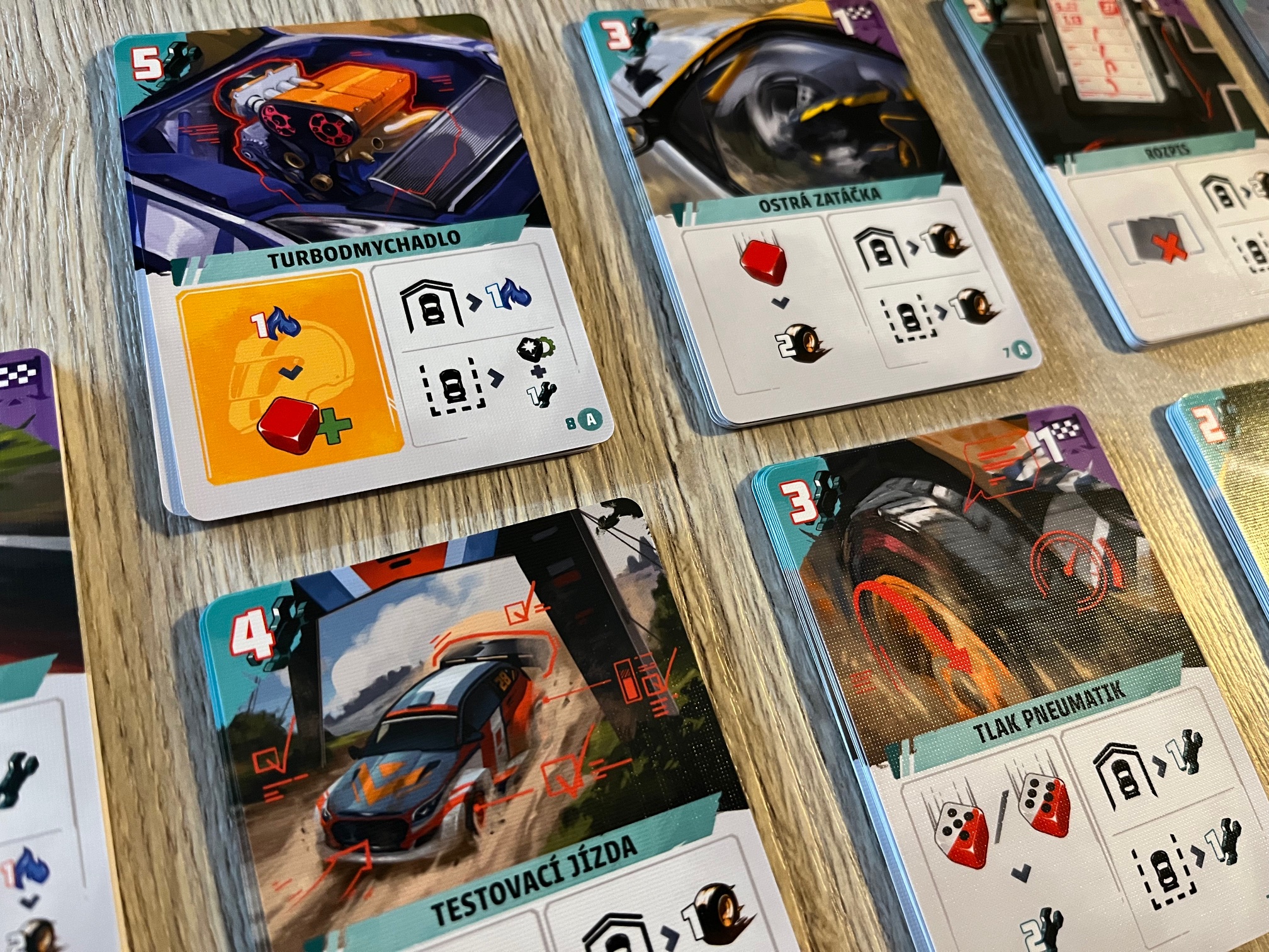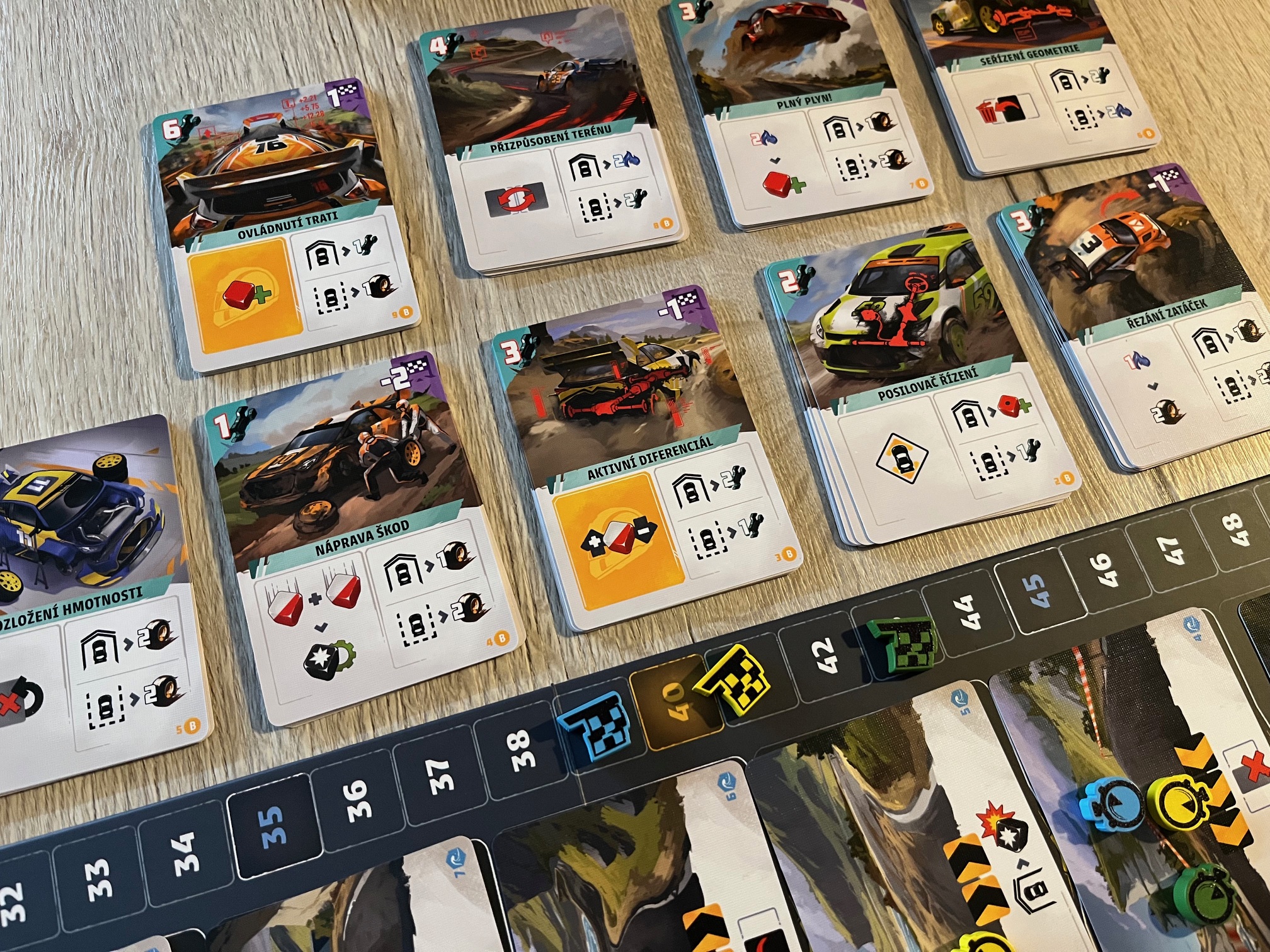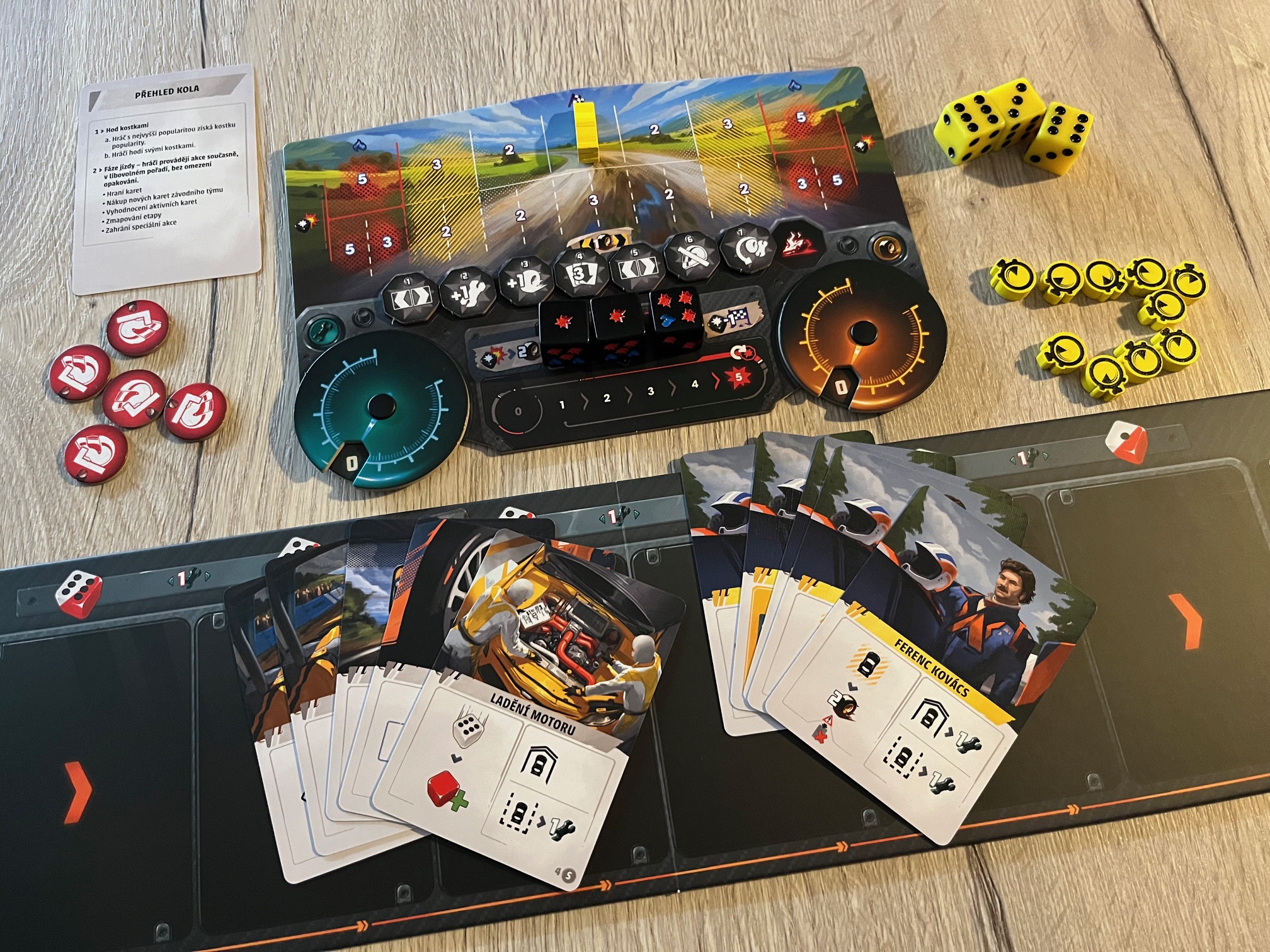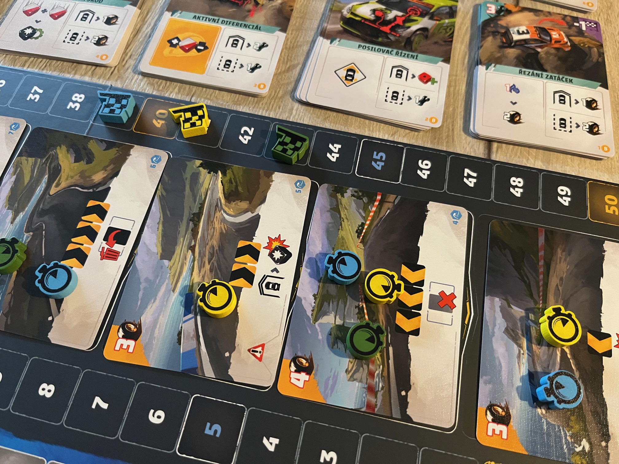 Na druhé straně se mi hra opravdu líbí z hlediska mechanik – líbí se mi nápad s tratí rozdělenou do etap, které hráči mapují pomocí navigátorů, aby za jejich zdolání získali bonusy, líbí se mi systém deck buildingu a hraní/vracení karet na postupně se posouvající stupnici, se kterou musíte během hry neustále pracovat a přemýšlet o pár kroků vpřed. Systém hry není složitý nebo vyloženě komplikovaný a hru lze docela rychle nastudovat i vysvětlit, ale správné zahrání a kombinace vyžadují větší um a zkušenosti. Zatímco na papíře vidíte jen pár akcí, cílem je vše dobře zkombinovat a ze všeho vytěžit maximum, takže akční fáze se roztáhne do několika možností. Právě propojení mechanik a celková promyšlenost všech prvků si mě získala na hře úplně nejvíc a přináší mi doslova radost objevovat spojení a kombinace možností.