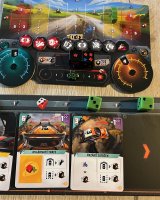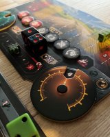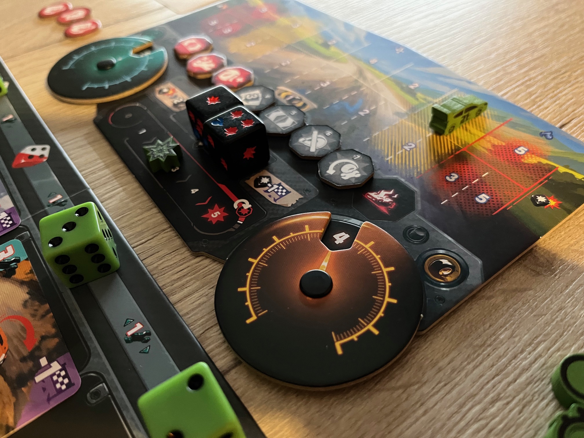 Osobně se mi hodně líbí zpracování komponent pro hráče, ať už jde o dobře rozlišené barvy a jednotlivé prvky, ale hlavně o skvělou desku hráčů, která v sobě spojuje maximální nabušené téma a herní praktičnost a funkčnost. Máte pocit, že koukáte čelním sklem, kde se po trati skutečně pohybuje vaše auto a otočné ukazatele zdrojů připomínají otáčkoměr a rychloměr.