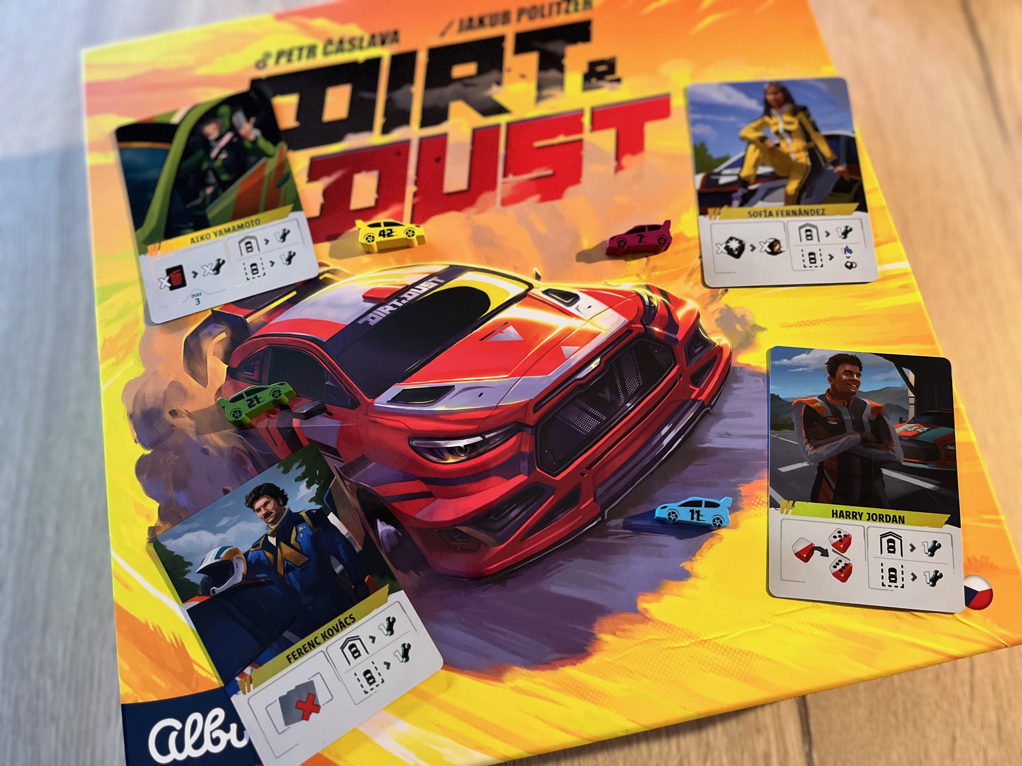 Petr Čáslava je jméno, které už asi slyšel každý, kdo se u nás jen trochu zajímá o deskovky. Nejde jen o roky fungující projekt Deskofobie, díky kterému získalo tohle hobby řadu fandů a povědomí o moderních deskovkách se rozšířili i mimo zaryté geeky, ale i o hru Kutná hora, která vyšla před několika málo lety, a kterou třeba já mám stále mezi nejoblíbenějšími hrami. Ne snad jen hrdým národním tématem, ale hra mi opravdu sedla herním systémem založeným na kartách, ale i originálním ekonomickém modelu. A o to víc jsem se velmi těšil, když vydavatelství Albi a Petr oznámili novou spolupráci, a to ve formě hry Dirt & Dust. A ta jak už název napovídá vůbec není historickým exkurzem, ale téma se zde přesunulo do divokého světa automobilových závodů rallye, kdy se hráči ujímají závodních týmů ve snaze optimalizovat své vozy, snažení, závodní um a rychlostí body vedoucí k vítězství. A ano, hned na úvod musím konstatovat, že si mě Petr novým počinem opět získal na plné čáře.