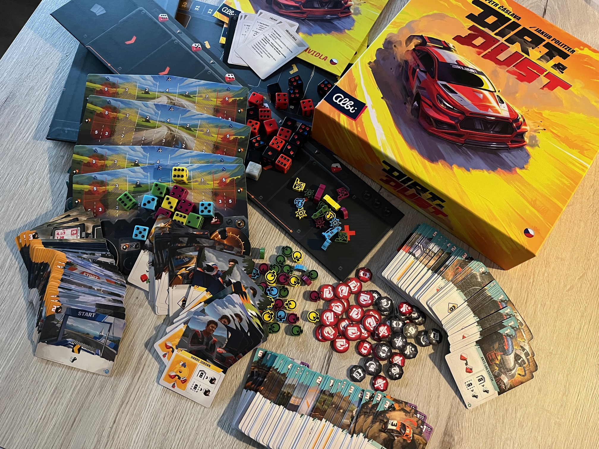 Nabušená krabice vonící napětím, benzinem a blátem létajícím od kol v tom nejlepším smyslu – to je Dirt & Dust, které nás prostě už při rozbalování a procházení komponent nadchlo. Kromě kvality komponent musím ocenit i pěkně a srozumitelně napsaná pravidla a zejména také použitou ikonografii na všech kartách a deskách, kdy vás sice může na počátku vše trochu zahltit, ale jakmile do hry proniknete, vše parádně a bez zádrhelů běží.