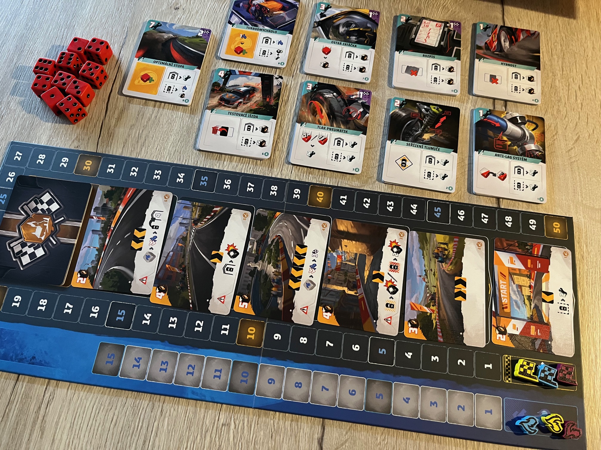 I díky množství komponent, ale hlavně kroků nepatří příprava hry mezi nejrychlejší – vyložíte několik desek, připravíte etapu, nabídku karet, ukazatele bodů rychlosti a každý hráč si musí připravit svůj panel, desku závodního týmu, ale i základní karetní balíček a zásoby žetonů a kostek. Dobrá zpráva je, že do hry můžete jednodušeji naskočit díky kratší variantě hry, obsahující kratší etapu (nehrajte si na hrdiny a zkuste to při první hře). Hra nezabere úplně málo místa, ale po rozložení vypadá prostě skvěle a znovu opakuji, že zpracování téhle hry se vážně povedlo.