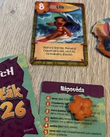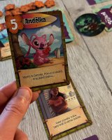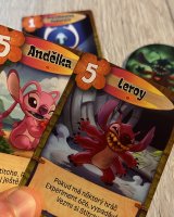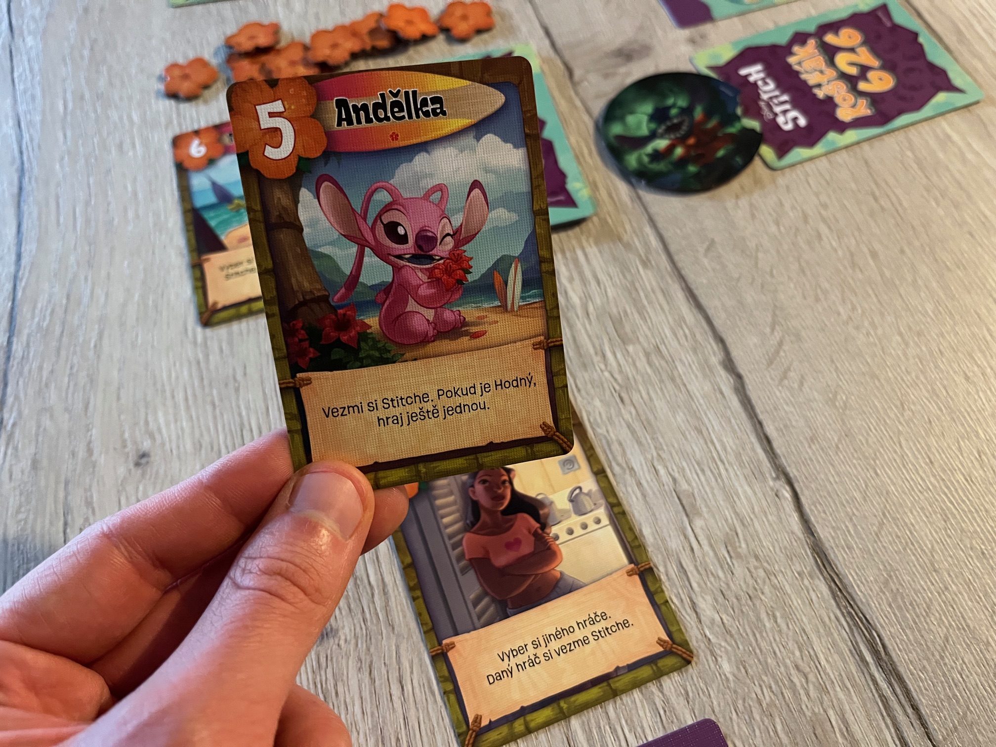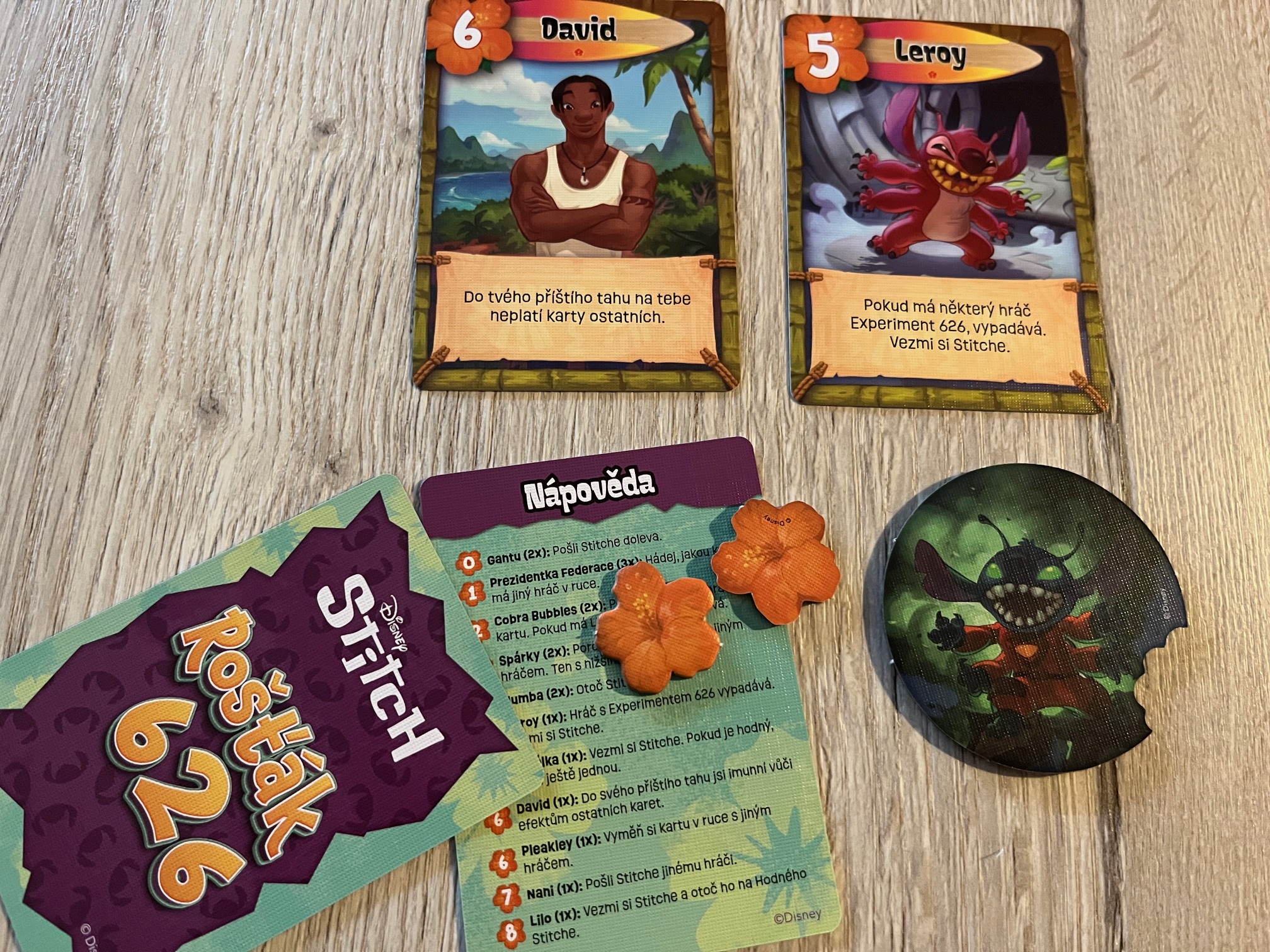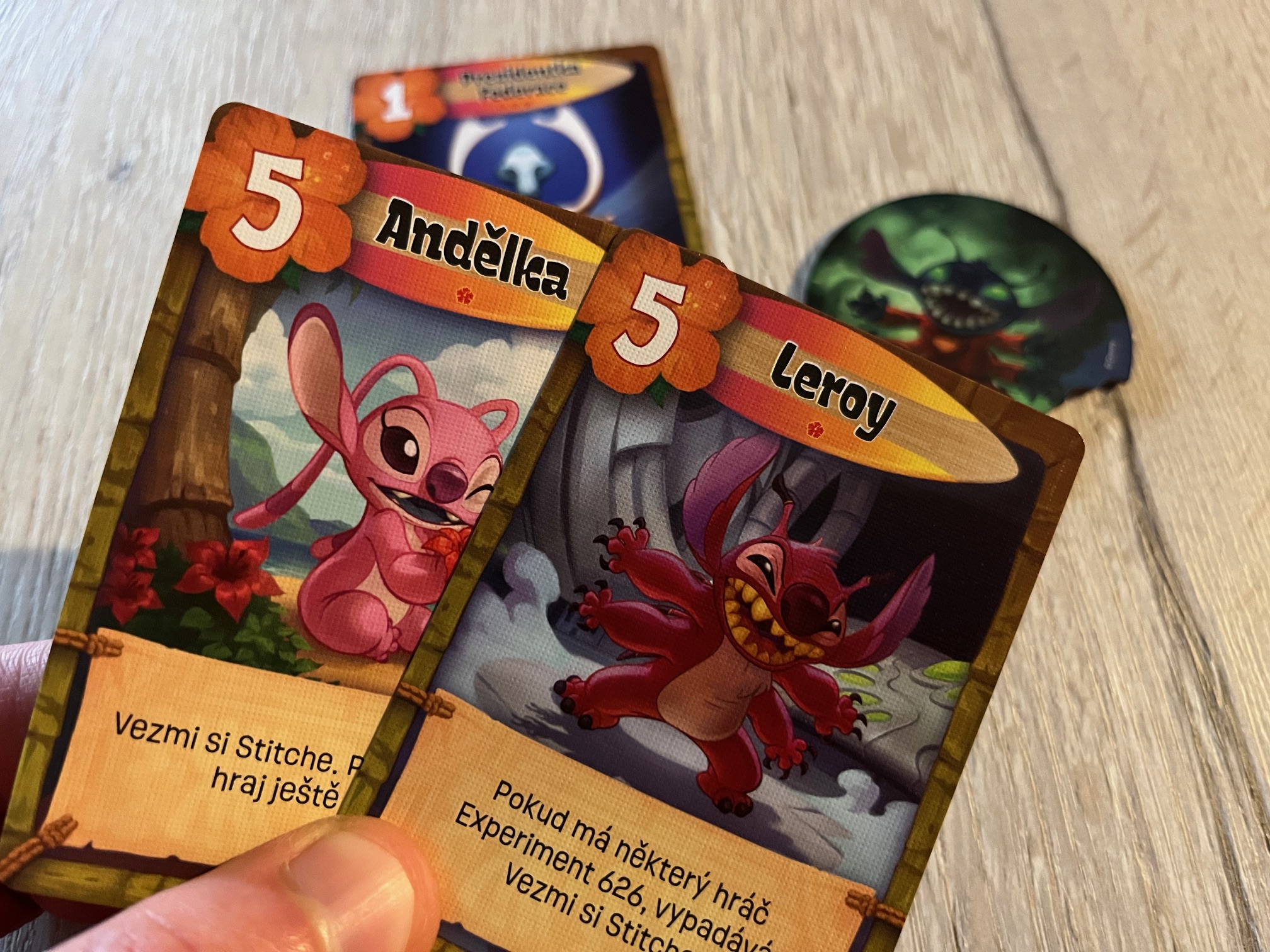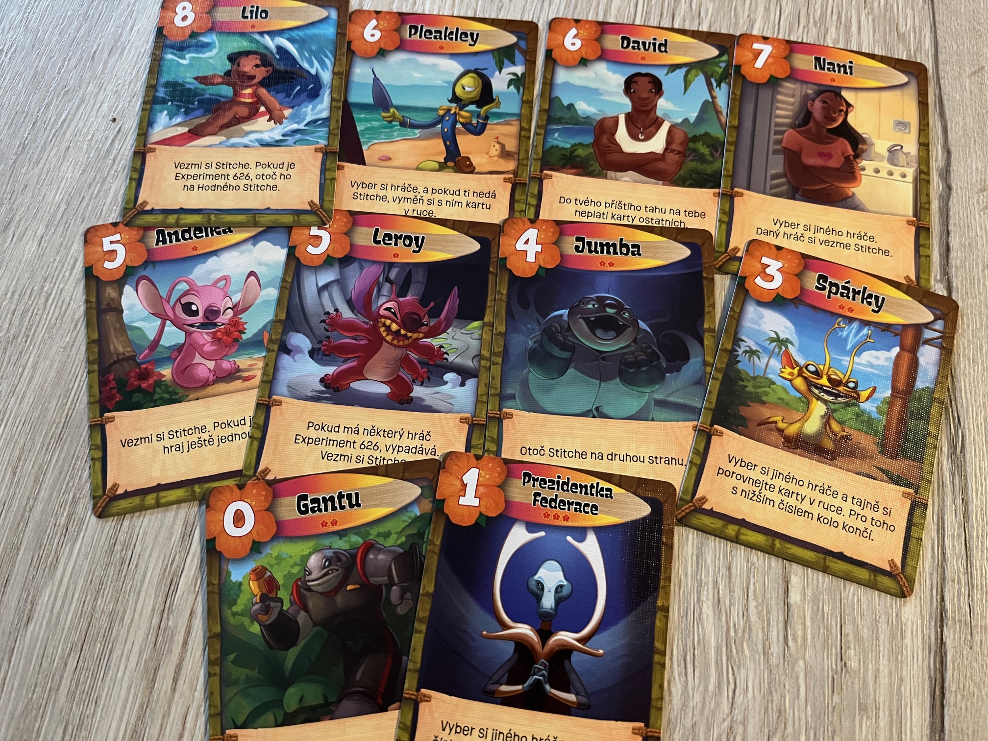 Co mě osobně trochu zamrzelo, to jsou žetony. U dopisů bývá standardem akrylové zpracování, ale zde se šlo „pouze“ cestou kartónu. Jasně, není to nic hrozného, ale za plastové bych byl přeci jen raději. Kromě bodovacích žetonů zde najdete oboustranného Stitche (hodný a zlý) a sadu 17 karet herních a 5 přehledových. Každá z herních karet obsahuje jednu z postav rozšířeného univerza modrého rošťáka, a tak tu najdete nejen Lilo či Nani nebo kapitána Gantu, ale i Leroye a Andělku (červený a růžový mimozemšťan a další z experimentů). Jednotlivé karty jsou postupně očíslovány od 0 do 8 a každá nese originální efekt, který částečně vychází z klasické hry (vyřazování, nahlížení k soupeřům), částečně pracuje s žetonem Stitche.