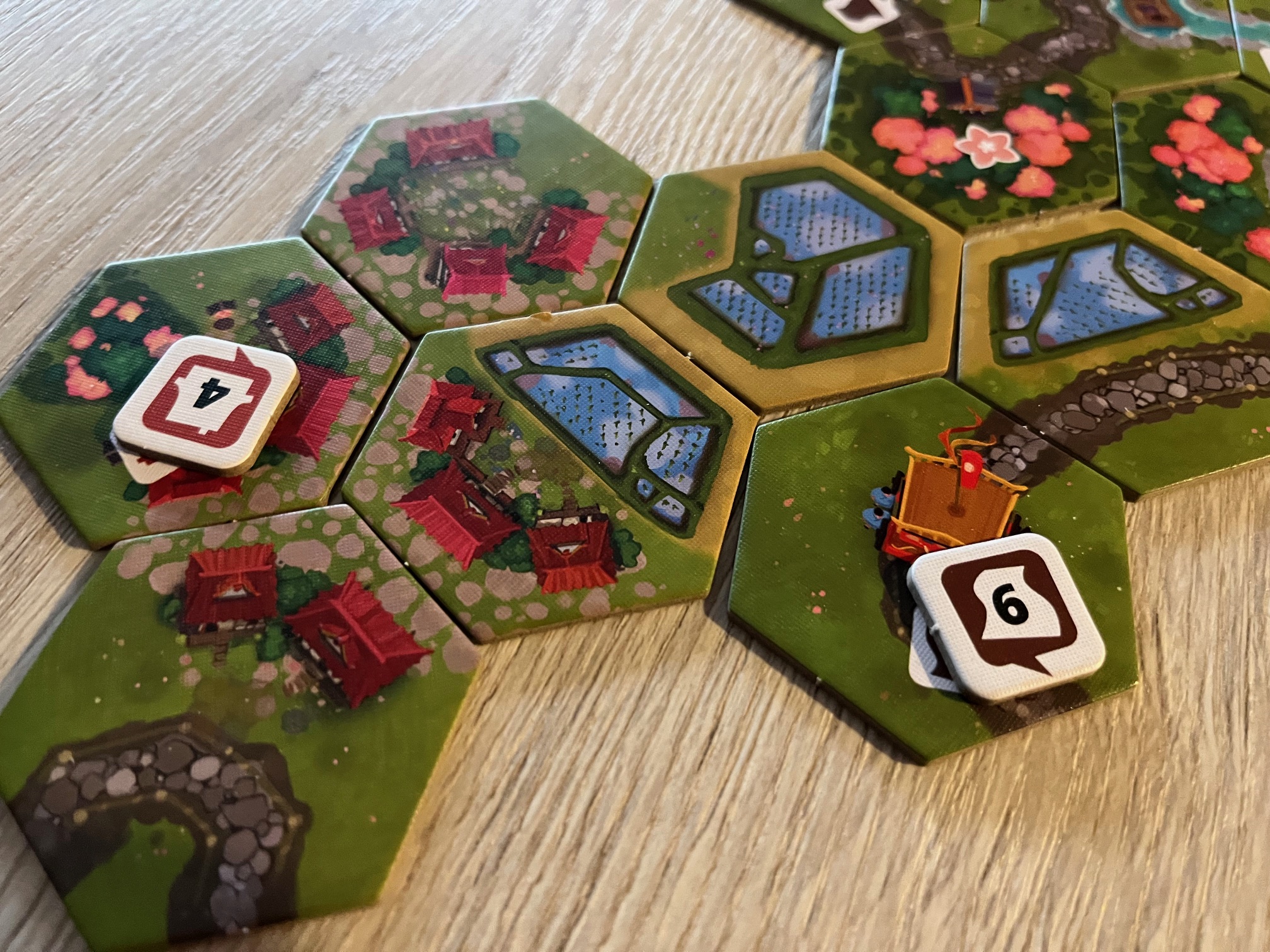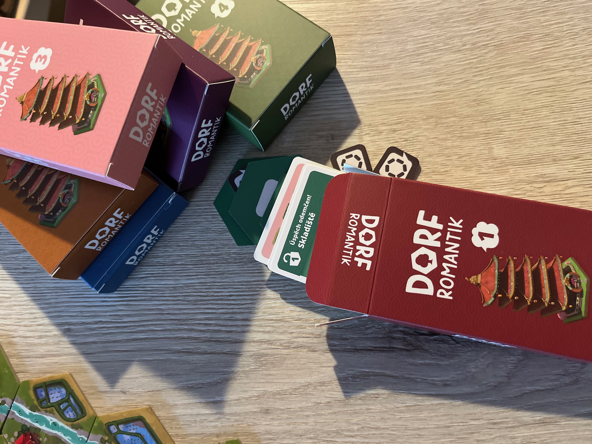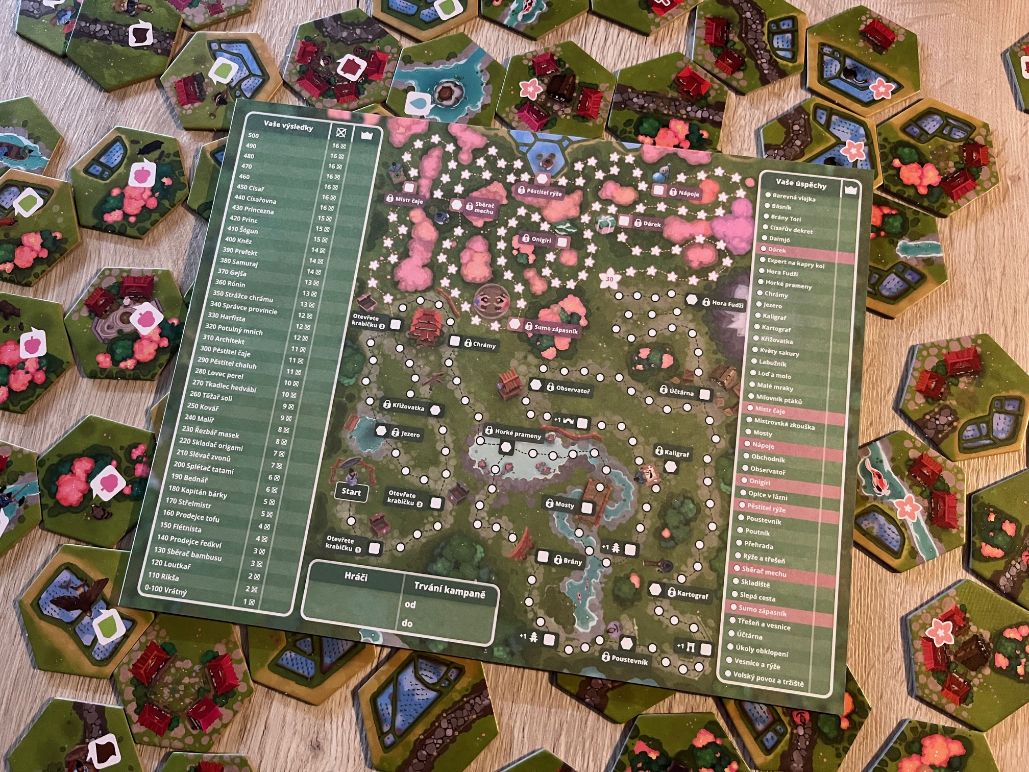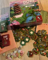 Pagoda, rýžová jezírka, třešňové háje – krabice se hrou je už na první pohled nádherná a navazuje atmosféru dalekého východu. A v takovém duchu a grafice se nese i celá hra, která se skládá primárně ze 73 destiček rozložených mezi 43 částí krajiny a 30 destiček úkolů a k nim 30 korespondujících žetonů úkolů. A kromě toho je zde (nejen) 6 krabiček s tajným herním materiálem, který se postupně otevírá během hry, respektive hraním dlouhé kampaně, kdy po každé hře využíváte získané body na postup po speciální stupnici pokroku, která určuje, co a kdy lze do hry přidat. A nového obsahu je požehnaně, ještě více než u původního Dorfromantiku a zároveň přináší do hry podle mě mnohem větší a zajímavější twisty a novinky. Ne, o těch vám cíleně nechci vůbec nic říct, protože nechci nikoho ochudit o překvapení. Lze snad jen zmínit, že hráče čeká skoro 50 karet, více než 70 destiček či speciální dřevěné figurky. A je to bomba.