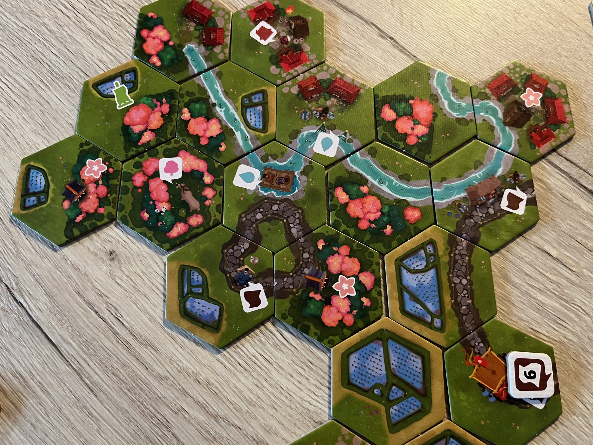Na začátku máte pět různých typů úkolů – třešňové, rýžové, vesnické, cestářské a říční, které vždy na číslech od 4 do 6 určují, jak velké je vytvořit území pomocí destiček pro jejich splnění. Průběh hry je snadný, kdy principem je, že vždy musí být do hry zapojeny 3 úkoly. Ty do hry vstoupí tak, že se ke krajině přiloží destička úkolů a na ní žeton určující podmínku. Ostatně to jsou první tři herní tahy. Následně ve hře probíhají tahy dobráním destičky (krajiny nebo úkolů) a jejím vyložením k mapě, kdy podmínek vyložení není zdaleka mnoho – snad jen že nelze libovolně ukončovat cesty či řeky vinoucí se krajinou a několik podmínek umístění destiček s úkoly či zmaření plnění úkolů. A v zásadě tohle jsou kompletní základní pravidla hry!
