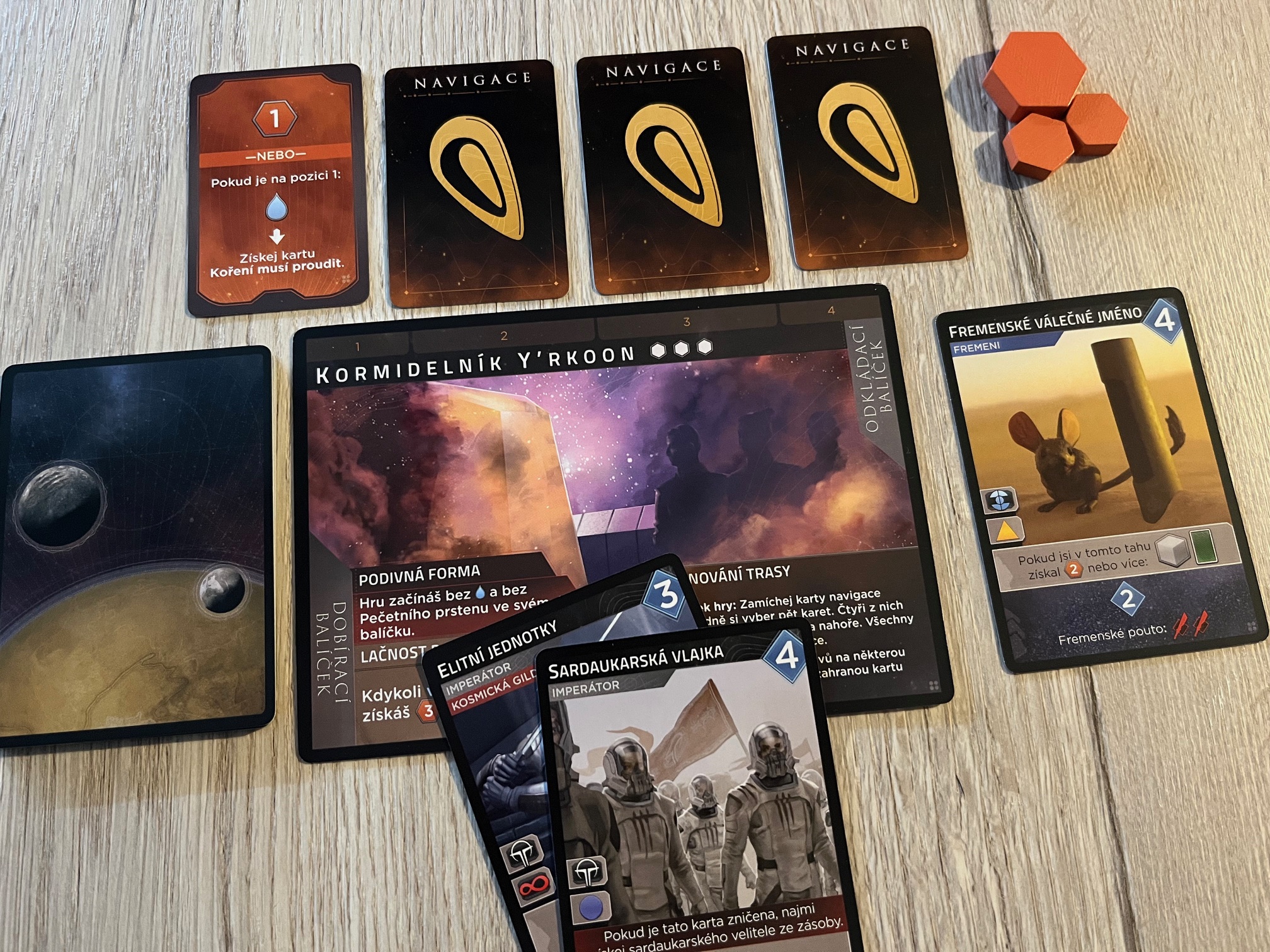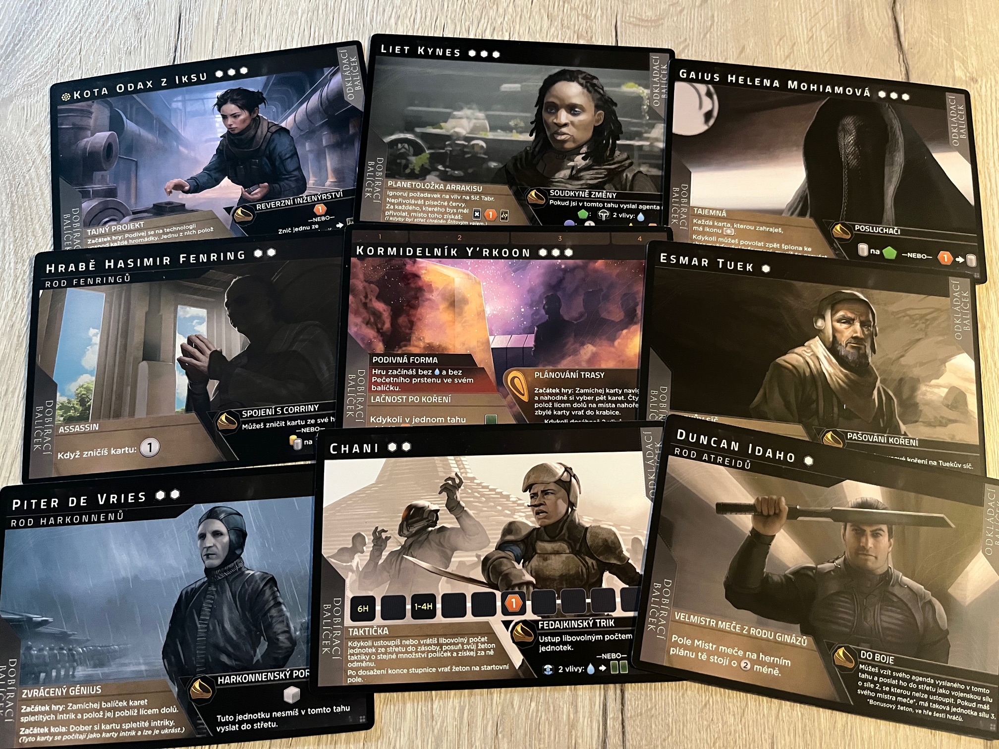 Mezi komponenty najdete v první řadě 9 nových vůdců, mezi kterými jsou takové postavy jako Duncan Idaho, Chani nebo Liet-Kynes, kdy k některým z nich se váží specifické komponenty. To hře přidává mnohem větší variabilitu a herní změny v podobě třeba navigačních karet, speciálních intrik pro mentata Pitera de Vries nebo pouštní síč pro pašeráka Tueka. K nim najdete v krabici nové karty impéria, nové intriky, karty konfliktu, které velmi jednoduše přidáte mezi stávající. Rozšíření se dočkal i povedený modul CHOAM.