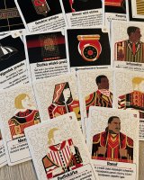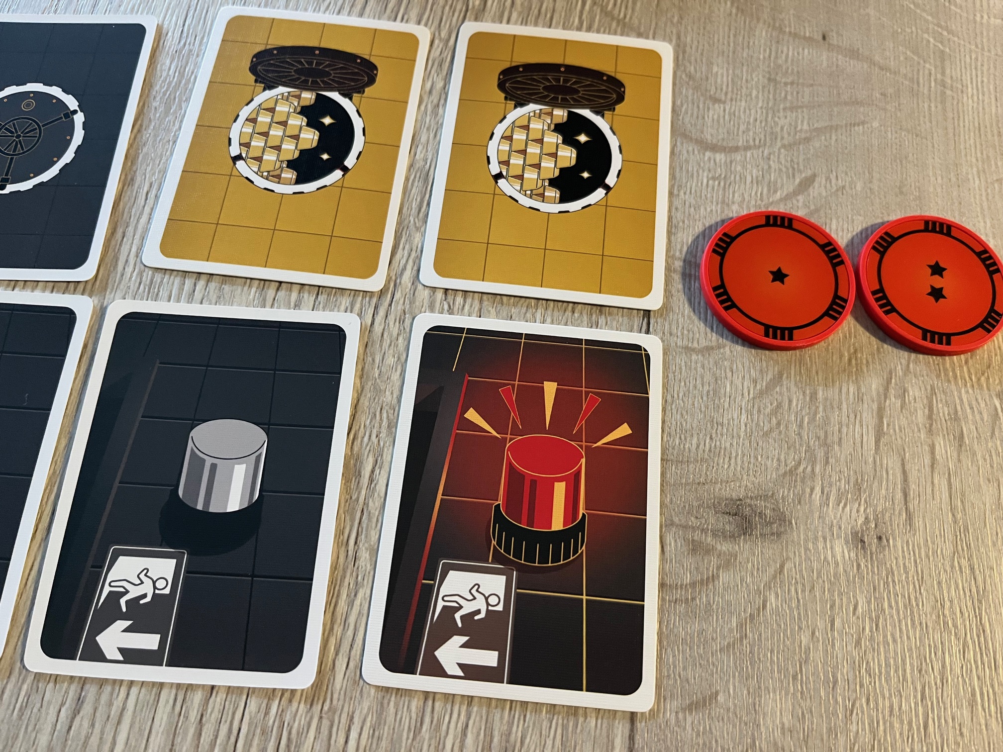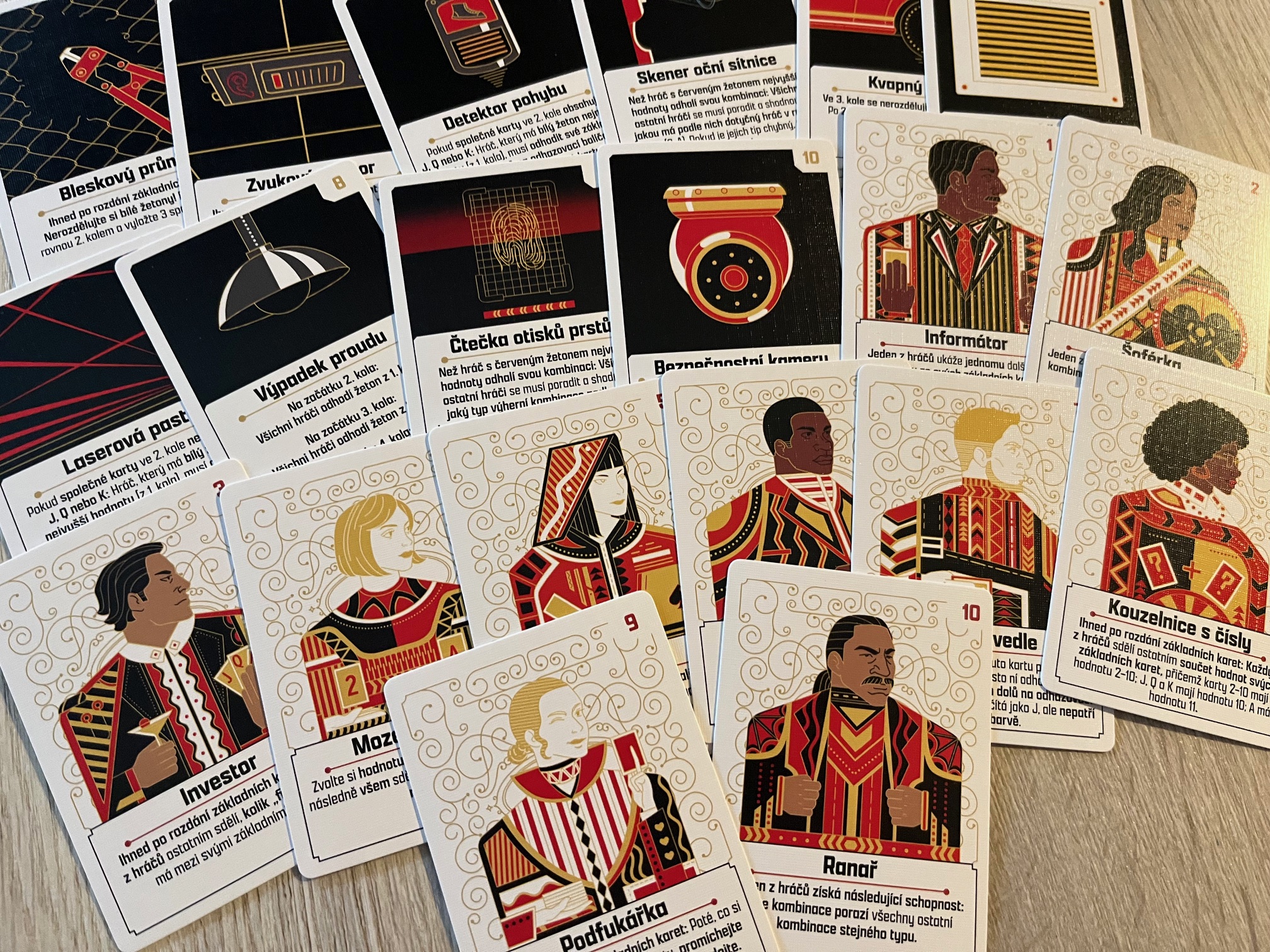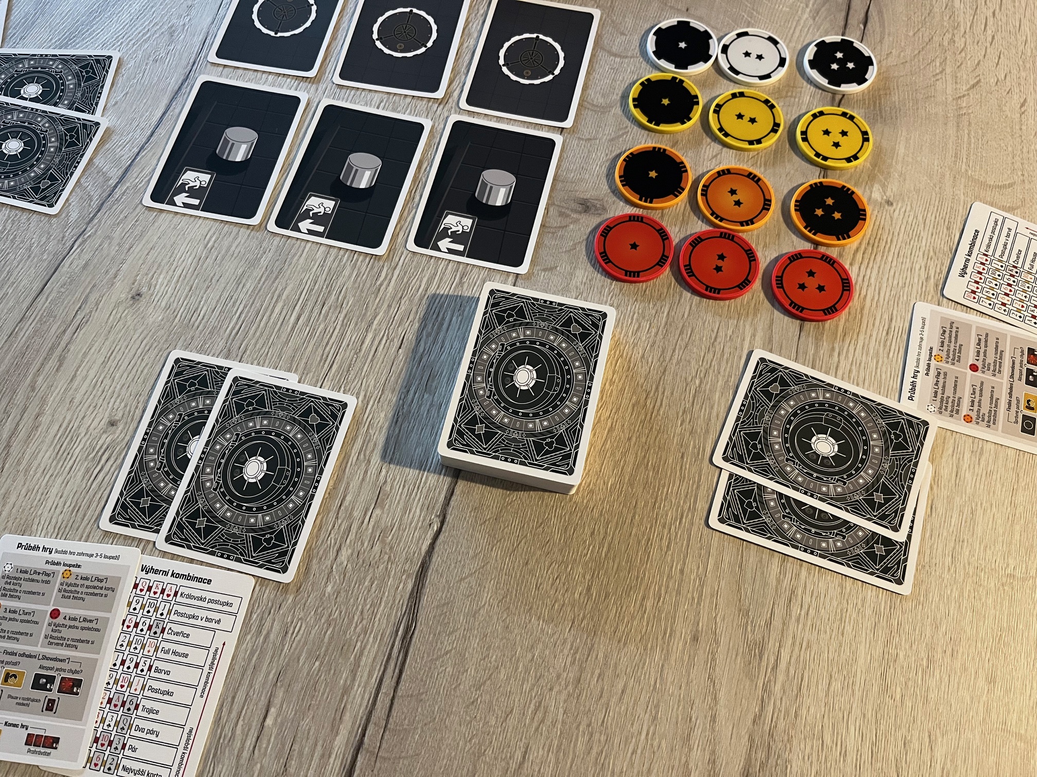 Pod víkem najdete, jak také jinak, hromadu karet a žetonů. Jednotlivé žetony jsou pomocí hvězd očíslovány od 1 do 6 a rozděleny do čtveřice barev. Jsou pěkně kvalitní, přehledné a příjemné na hraní. Karty nezabírají jen klasické hrací v podobě 52 karetního balíčku na poker, ale i přehledové karty, výzvy, specialisty a hlavně trojici alarmů a trezorů, které slouží k zaznamenání úspěchu či naopak neúspěchu. Co musím pochválit, to je kvalita karet – pěkně pevné, příjemné na hraní a rozhodně vydrží i bez obalů. Ono celkově na to, že se jedná o v zásadě menší karetní hru, je zpracování velmi pěkné a kvalitní.