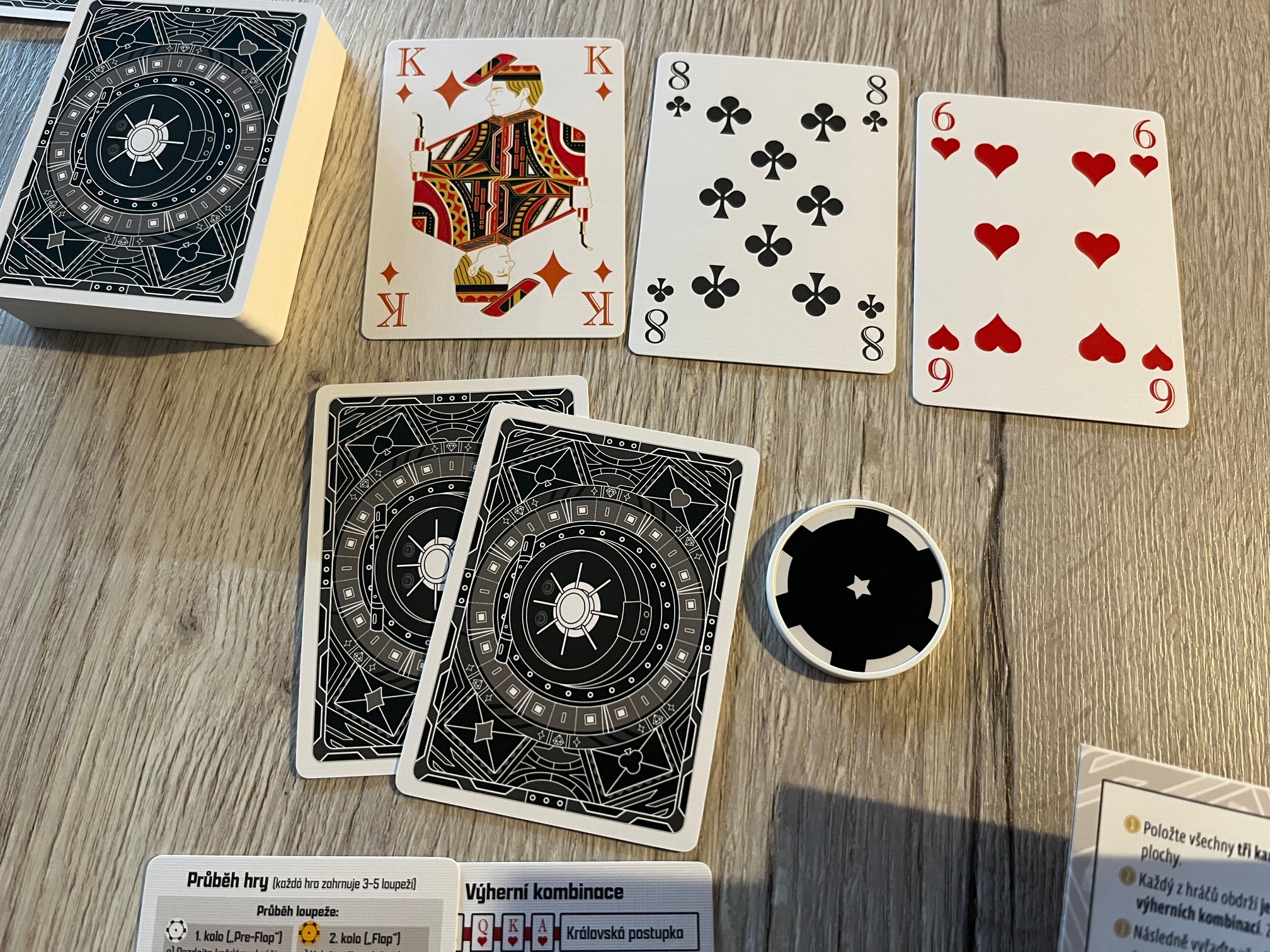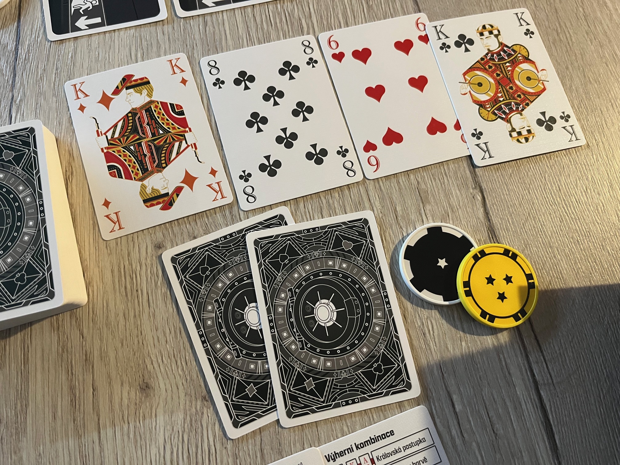 Balení hry je na jedné straně minimalistické – sada karet a žetonů, toť vše – ale už od prvního pohledu je vše velmi pěkně zpracované, kvalitní krásný box, hezké žetony i povedené karty, se kterými si klidně můžete zahrát i klasický poker.