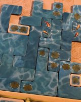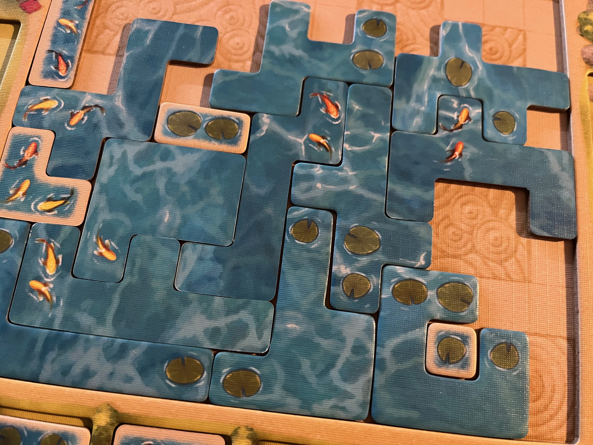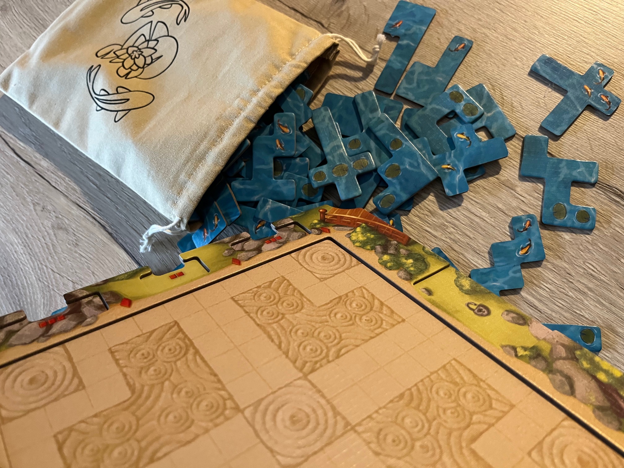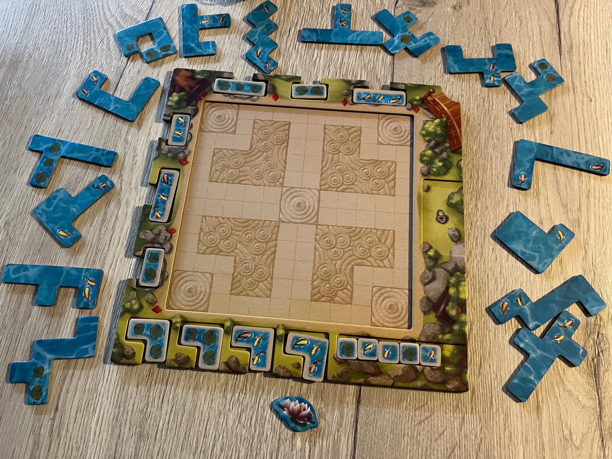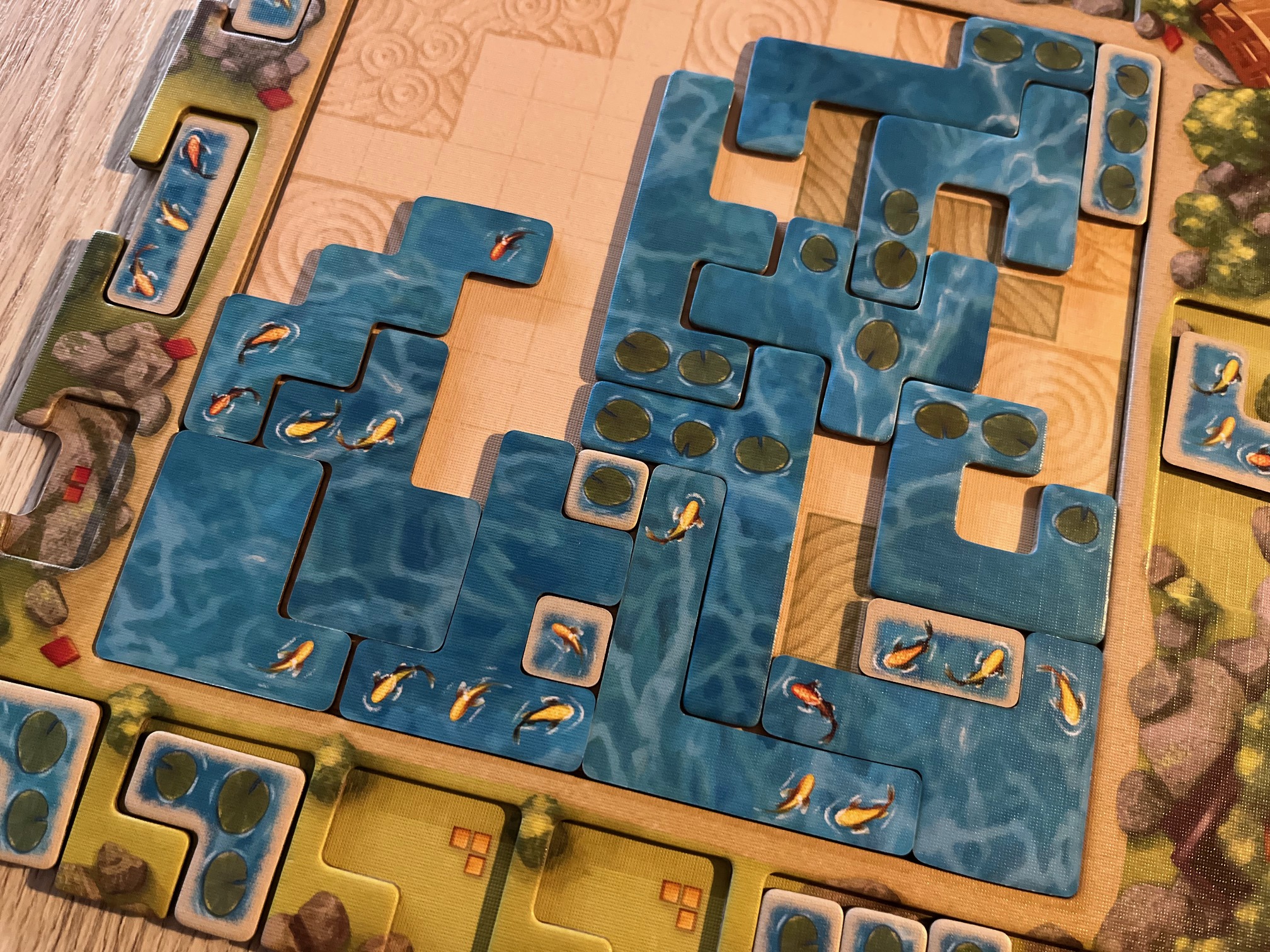 Cíl hry? Propojovat celé řady a celé sloupce (o 12 polích) a vytvářet skupiny aspoň 7 kaprů či leknínů. Případně se připočítají body za skupiny sousedící s umístěnou dekorací. Jak snadné, že? Ano, herně se prostě jedná o strašně čistou a přístupnou hru. A tady se ukazuje, jak velké zkušenosti má Uwe jako deskoherní designér, a že právě tetrisové skládání umí být jeho doménou, jak nám ostatně v řadě případů již ukázal.