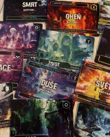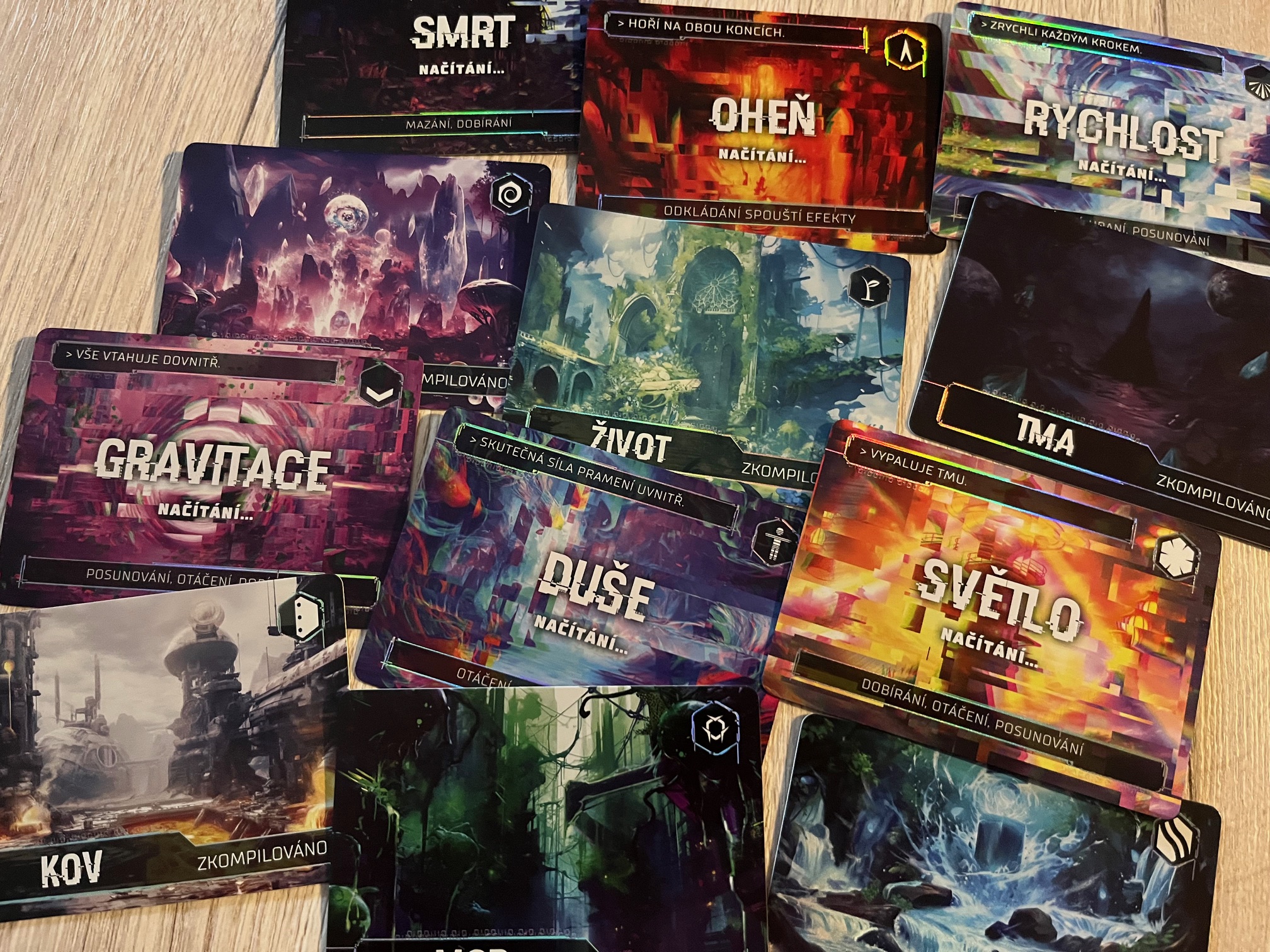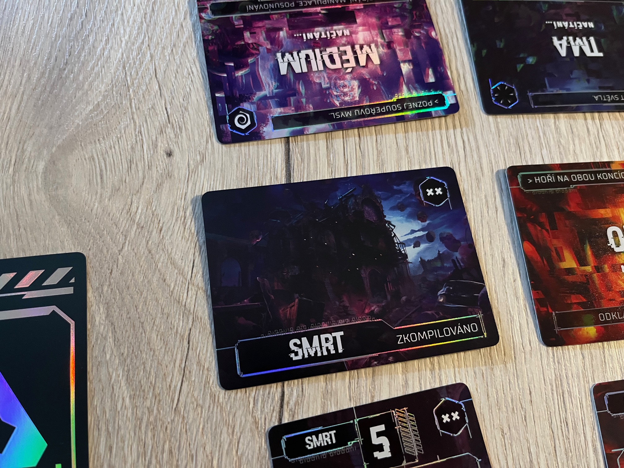 Kód je hrou, která na fotkách a propagačních materiál nikdy nevynikne svým zpracováním tak jako ve fyzické podobě. Ono totiž už krabička se krásně leskne, ale hlavně se nádherně lesknou všechny obsažené karty, na kterých hra stojí. Respektive karty jsou kromě pravidel jedinou komponentou hry. Ve hře najdete 12 karet protokolů – unikátní části umělé inteligence jako smrt, gravitace, naděje, oheň, kov, mor a další. Ke každému protokolu pak náleží 6 unikátních karet příkazů, které obsahují jednak číslo, jednak řadu efektů. Nutno podotknout dvě věci – každá sada karet je unikátní a jiná, každý aspekt se zaměřuje na něco jiného a hraje se odlišným přístupem. A také zpracování karet, které je prostě nádherné. Nejen že se karty krásně lesknou, ale také mají velmi dobrou kvalitu s plastovým efektem a povedenou tematickou grafikou.