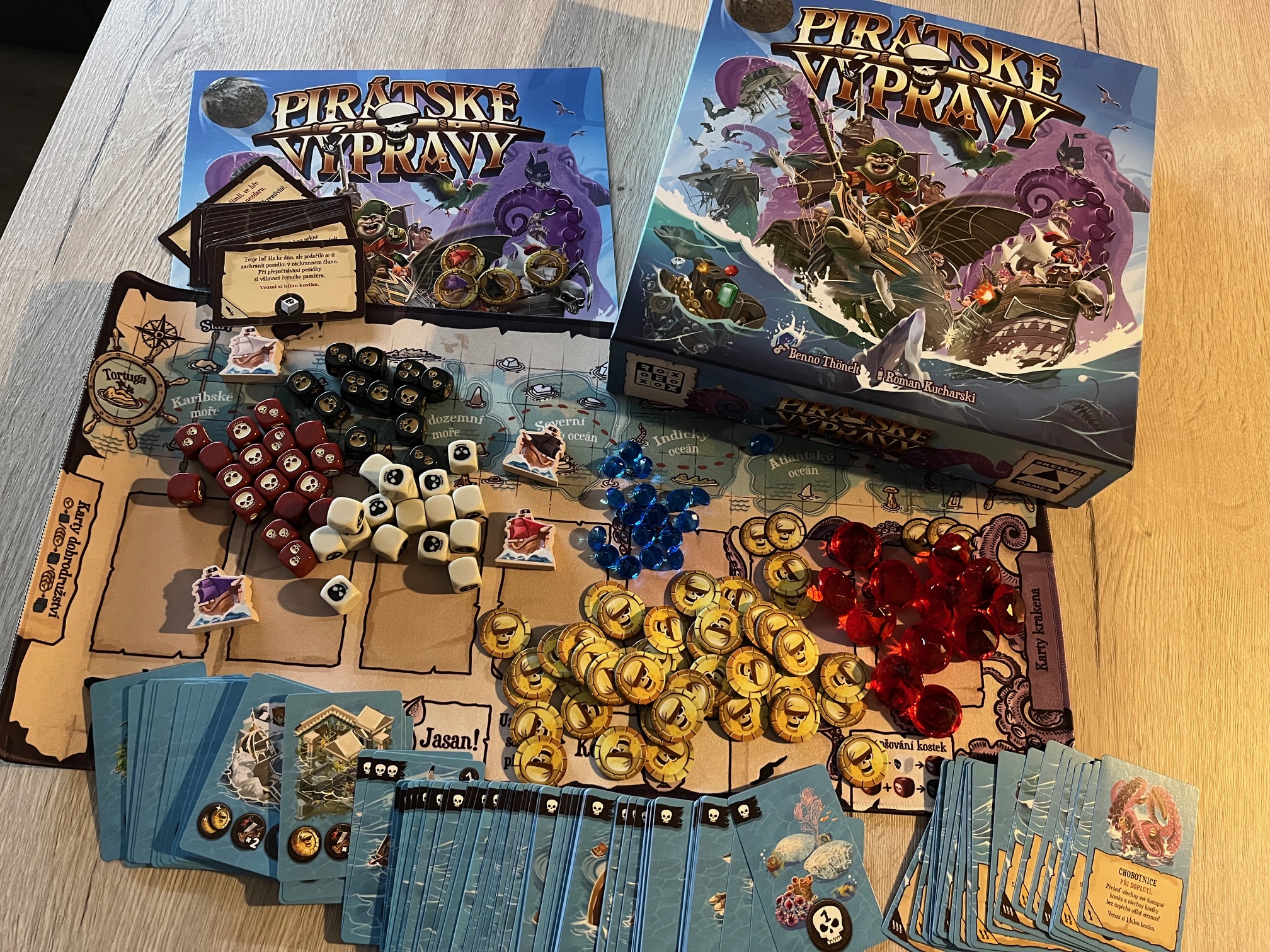 Pirátské výpravy jsou rodinnějším, lehčím titulem založeným na kostkách, kartách a push you luck mechanismu a stojí za ní Benno Thönelt, který hru vytvořil pro 2-4 hráče od 8 let a s herní dobou okolo 40-60 min na jednu partii. Každý z hráčů se stává pirátským kapitánem na vlastní lodi, který se spolu s posádkou plaví stále na delší a nebezpečnější výpravy za slávou a bohatstvím a ve snaze vyhnout se nezdarům a zpropadeným chapadlům mocného krakena!