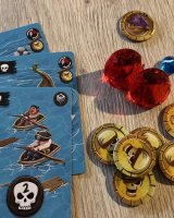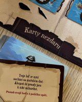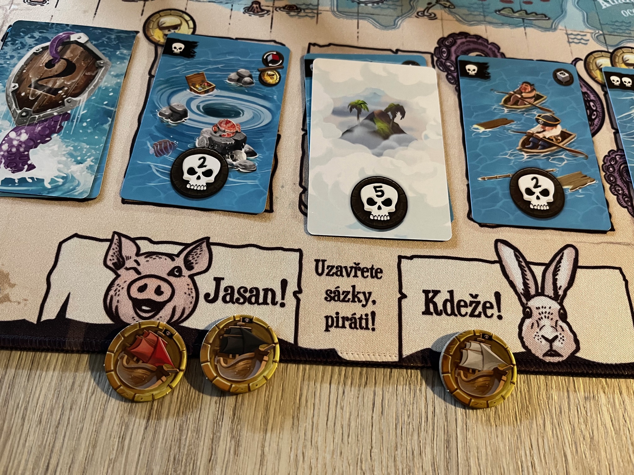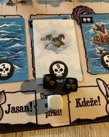 Na začátku hry je důležité se rozhodnout, jakou variantu budete hrát – rodinou, skutečně pirátskou či náhodnou, což se odvíjí od zvolených karet nezdaru. Kromě nich připravíte herní plán, lodě na počáteční pole, bokem zásoby kostek a mincí s drahokamy a na příslušná místa karty ostrovů a krakena. A nesmím zapomenout na balíček dobrodružství. Každý hráč z něj obdrží dvě karty, k tomu 3 mince - dublony, jednu minci pro štěstí pro sázení a 5 bílých základních kostek.