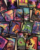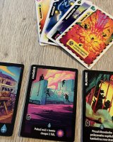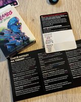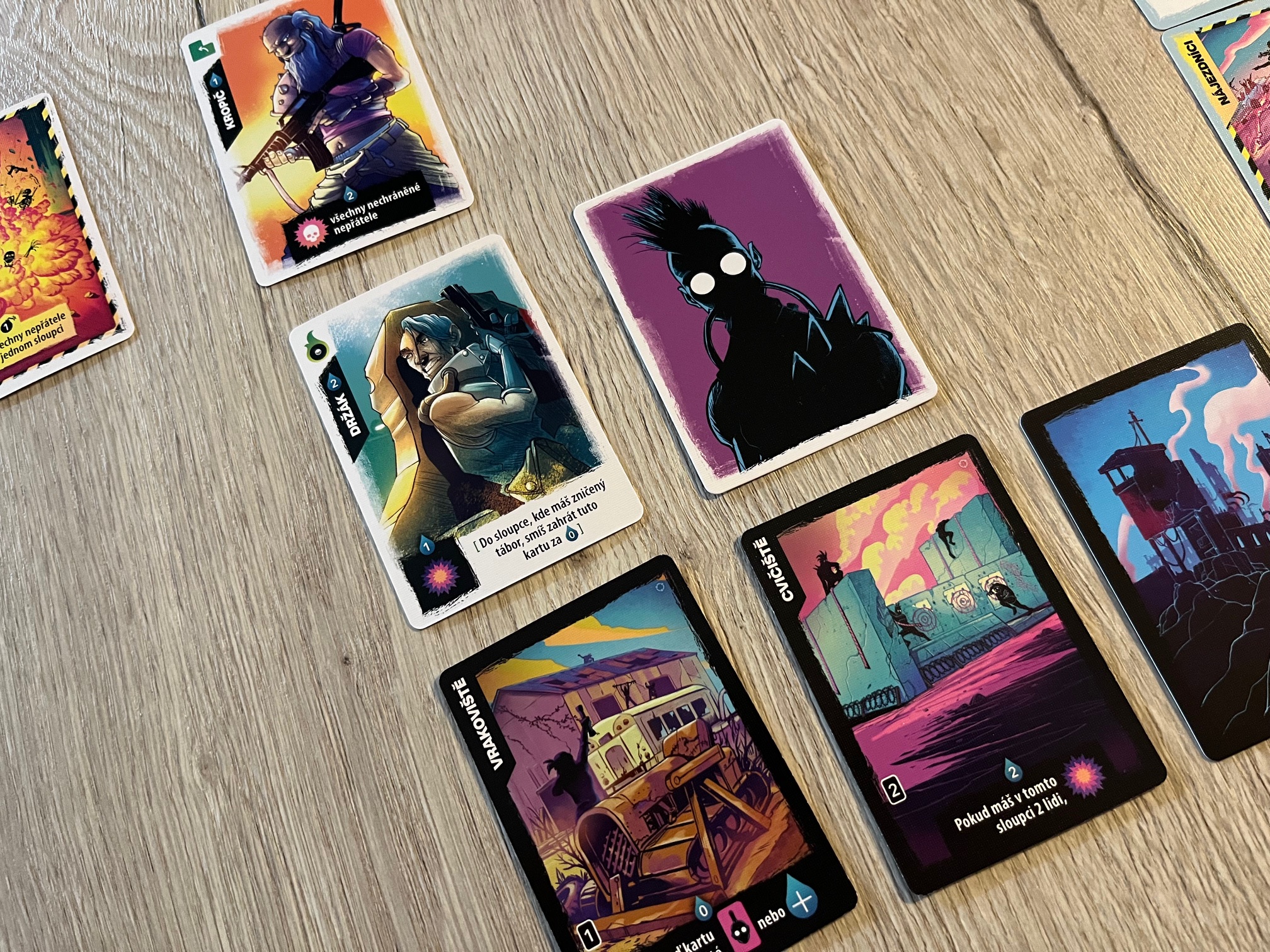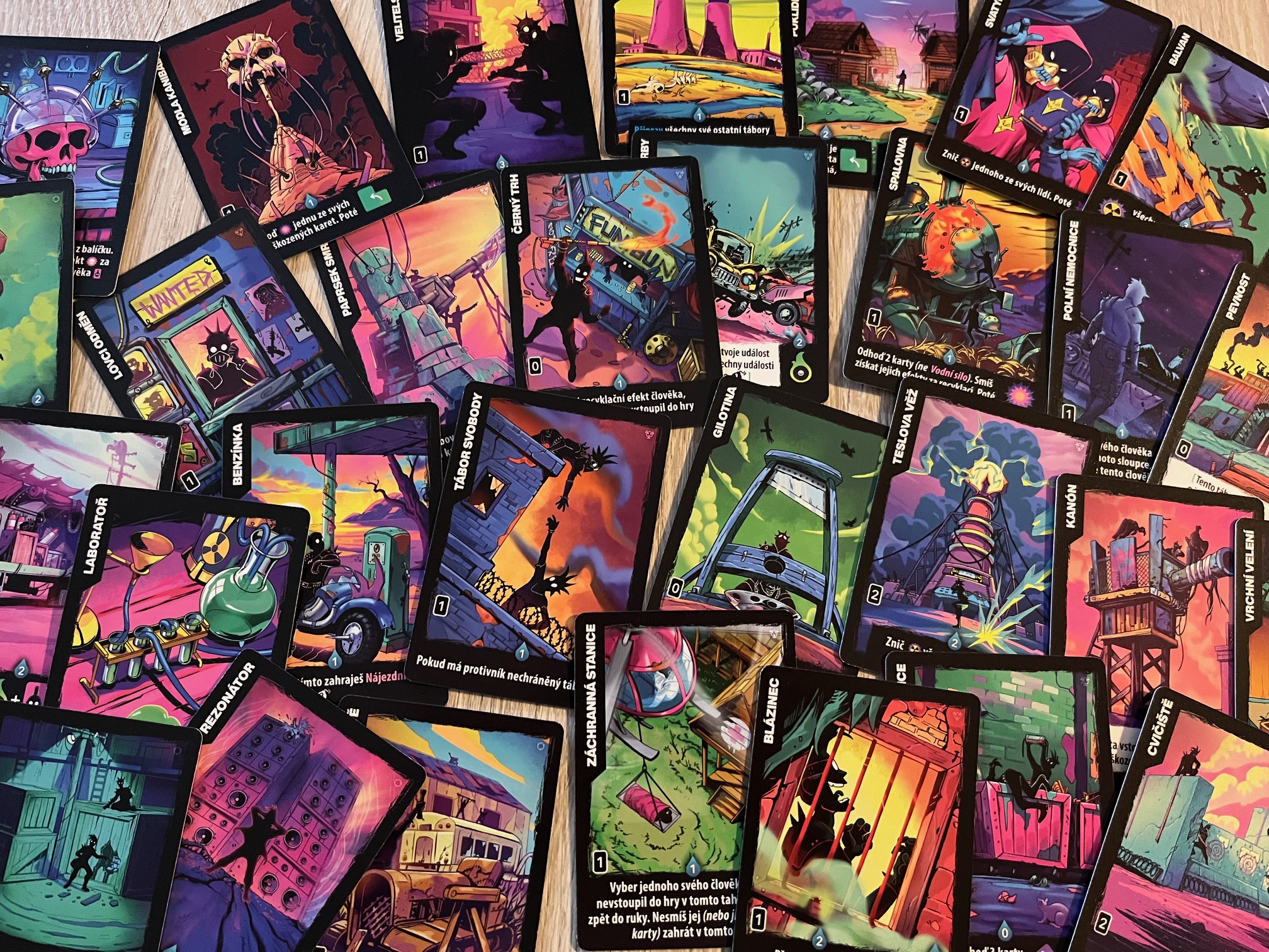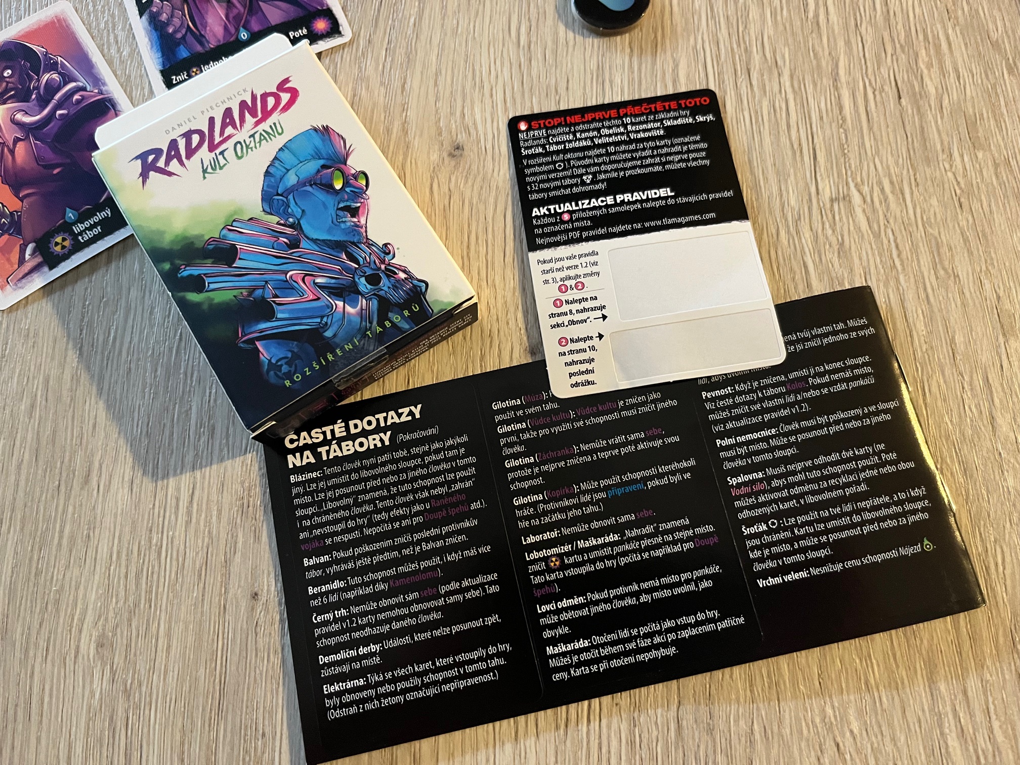 Ano, menší papírová krabička s křiklavou grafikou Mannyho Trembla obsahuje jen a pouze 42 karet táborů a samolepky pravidel. To je mimochodem super řešení – žádný malý sešítek, který někde ztratíte, ale samolepky nalepíte na poslední stranu původních pravidel, případně pokud máte starší původní verzi pravidel, upravíte si dvě věci uvnitř pravidel menšími přelepkami. No a 42 karet je rozdělených mezi 32 karet zcela nových a 10 upravených, které nahrazují ty z původní hry. Ano, připravte se opět na šíleně barevnou grafiku plnou postapokalyptické atmosféry, barevných detailů, křiklavých linek a surovosti. Rozhodně se nejedná o hru pro každého, ale fanoušky komiksového barevného stylu potěší na maximum a skvěle zapadne do původní hry. Navíc rozšíření bez větších problémů uložíte do původní krabičky, a to i s obalenými kartami. Jen samozřejmě v boxu nemáme původní insert.