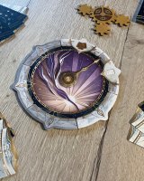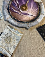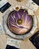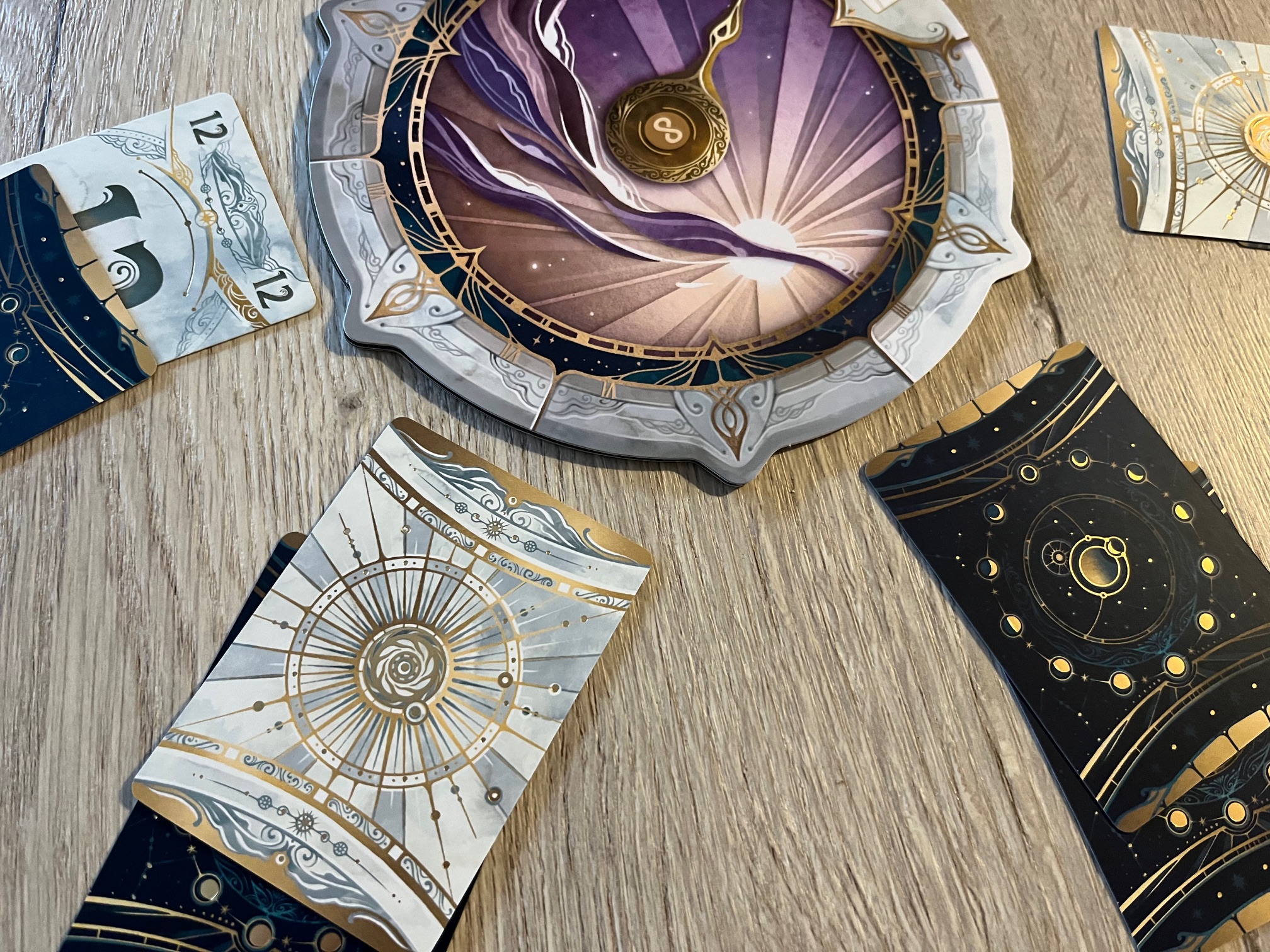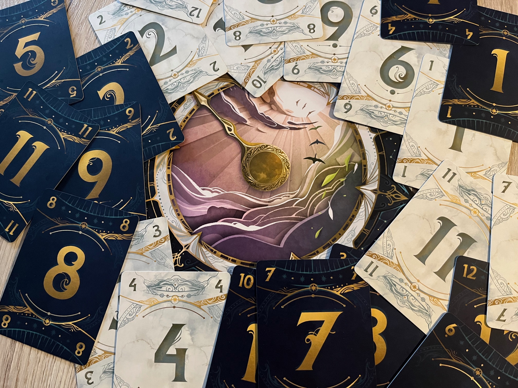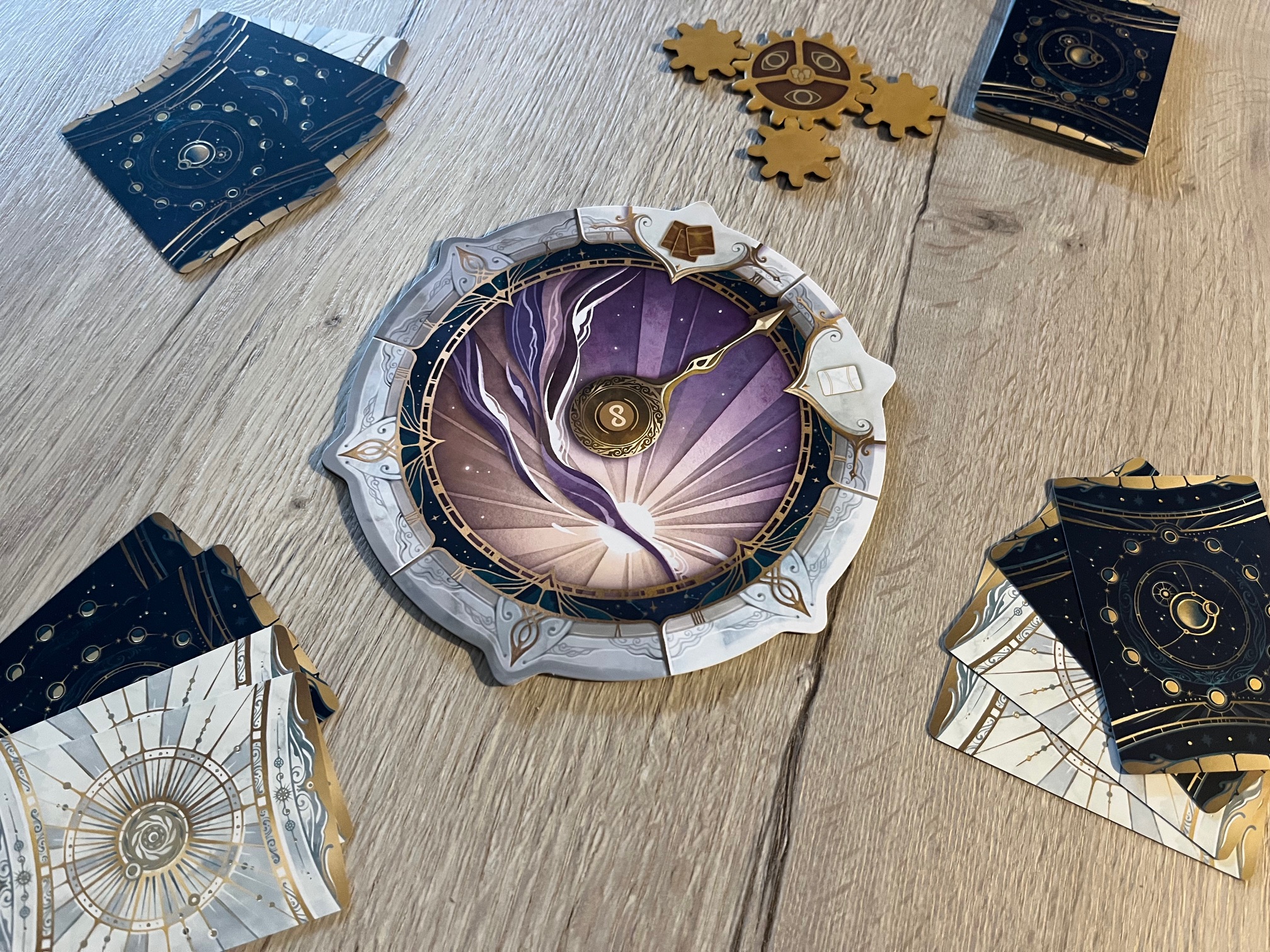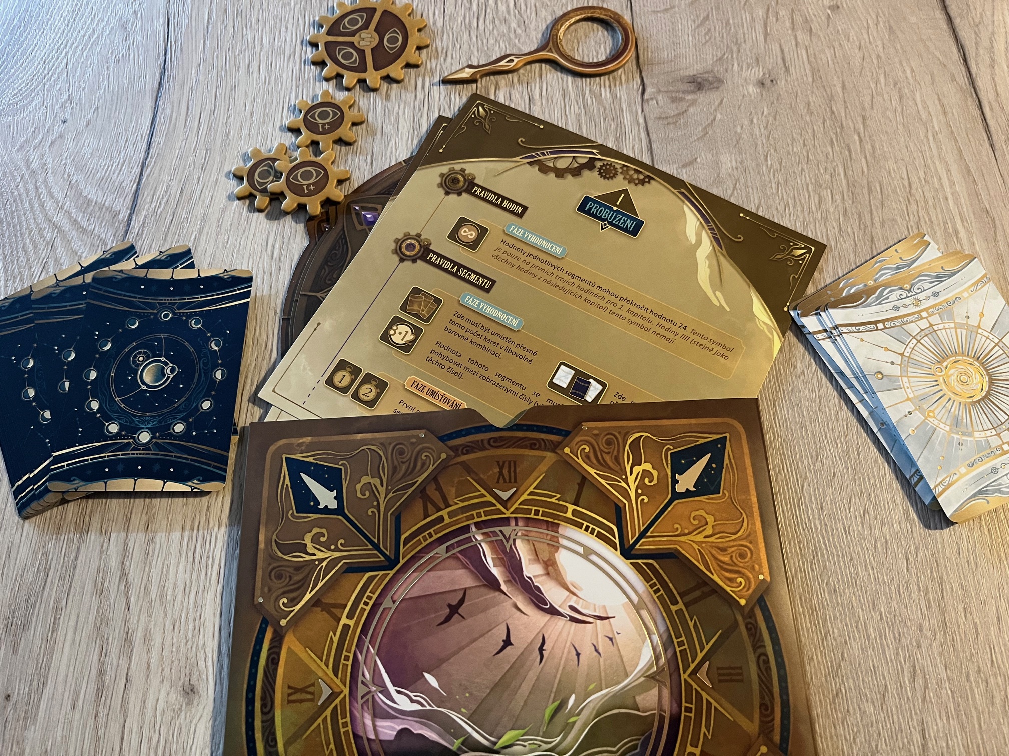 Lehce vám nastíním hru a její princip – z první obálky vytáhnete sadu 4 hodin a položíte je doprostřed stolu s prvními otočenými vzhůru. Zamícháte všechny karty – celkem jich je 24, 12 slunečních a 12 měsíčních – a každému dáte počet určený počtem hráčů (od 3 do 6). Bokem se položí žeton připomínky sloužící jako možnost takové nápovědy a případně k němu hodinovou ručičku (v pozdějších partiích).