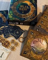 Síla času je graficky nádherná hra. To jednoduše nejde napsat jinak. Už pohled na krabičku je magický, ale po rozbalení a vyndání herního obsahu musí být každý nadšený, ať už jde o černé a bílé měsíční a sluneční karty opatřené zlatými doplňky či jednotlivé hodiny, které udávají nejen zvláštní pravidla výzvy, ale také jsou opatřeny doslova magickou ilustrací, jakou by se nemusela stydět hra jako Dixit nebo třeba Mysterium. Jednotlivé hodiny jsou ve skupinách dle výzev a časového řekněme období rozřazeny do zavřených obálek, které postupně během hry otevíráte, jak se prokousáváte gradujícími výzvami od první až po čtyřicátou. Rozhodně nechci spoilerovat obsah obálek, ale je na co se těšit. Ostatně už první je více než zajímavá. Kromě toho najdete v krabici ještě sadu žetonů jako hodinovou ručičku a speciální obálku na nezvládnuté výzvy odložené na později. Nic vás tak nenutí se zaseknout a nemoci pokračovat dál, i když zvládnout výzvy v postupném pořadí je nejlepší.