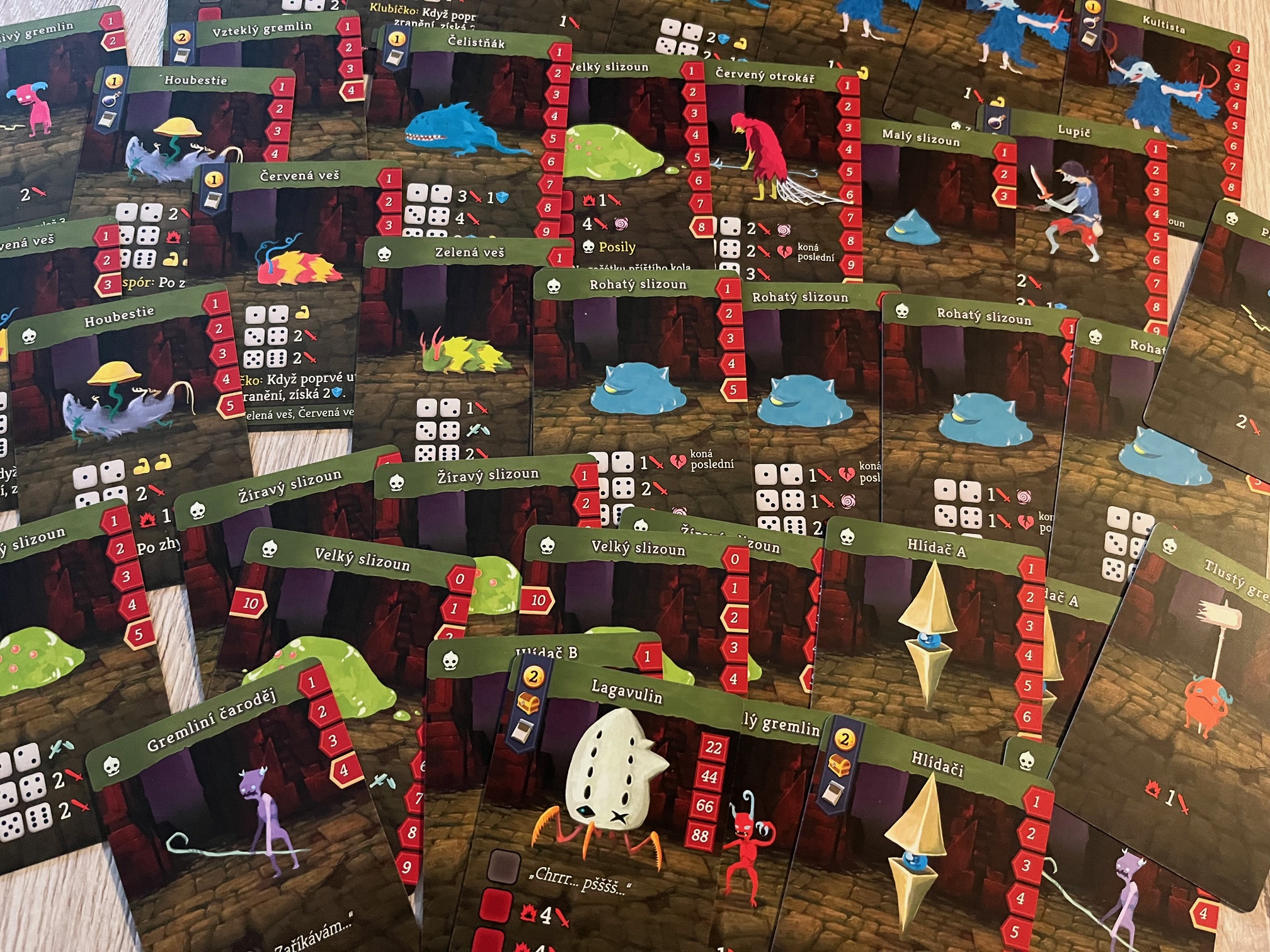 Když bych měl uvést nějaký ten příklad herního kola, vezmeme si třeba Železňáka v sólo variantě. Ten na herním plánu vstupuje na pole nepřátel. Z balíčku je mu přiřazen nepřítel v podobě barevného kousavého červa, který je možná úsměvný, ale jeho ostrá zubiska umí potrápit. Železňák bere na začátek do ruky 5 karet ze svého balíčku a snaží se jejich kombinací a hraním za energii skolit soupeře. Po odehrání tahu hráče hraje automatický protivník, pak zase hráč, a to až do porážky jedné ze stran. V ideálním případě potvory, protože smrtí byť jen jediného hrdiny končí celá hra prohrou a neúspěchem. Během tahu může hráč navíc využívat nejen své herní karty, ale i různé relikvie či lektvary, zkrátka takové klasické RPG.
