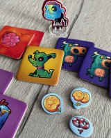 Hra Trablíci utíkejte! zaujme děti i dospělé už na první pohled svou barevnou, komiksově laděnou krabicí, kdy o grafický háv se postaral Petr Štefek. Ten si se hrou pěkně vyhrál, osobně se mi grafika líbí, i když nejsem zrovna velký fanda zombie tematiky. Po otevření menší krabičky vás čeká zejména hodně loupání. Je totiž skoro až po okraj naplněna archy žetonů a destiček, které tvoří v podstatě celý obsah hry, ať už se jedná o destičky zvířat, počáteční želé, standees figurky či kruhy nebo mince a vzducholoď, do které všichni utíkají. Ostatně kromě loupání už na vás čekají jen podstavce pro standee figurky, dřevěné kostky a pravidla. Ta jsou velmi příjemně napsaná a krátká, jen škoda jednoho nebo dvou překlepů, které trochu chytnou za uši. Ale nejedná se o nic dramatického. Ostatně dětské hry musí být přístupné a pravidlově nenáročné, aby se je účastníci dobře a rychle naučili a partie nebyla ani zbytečně dlouhá.