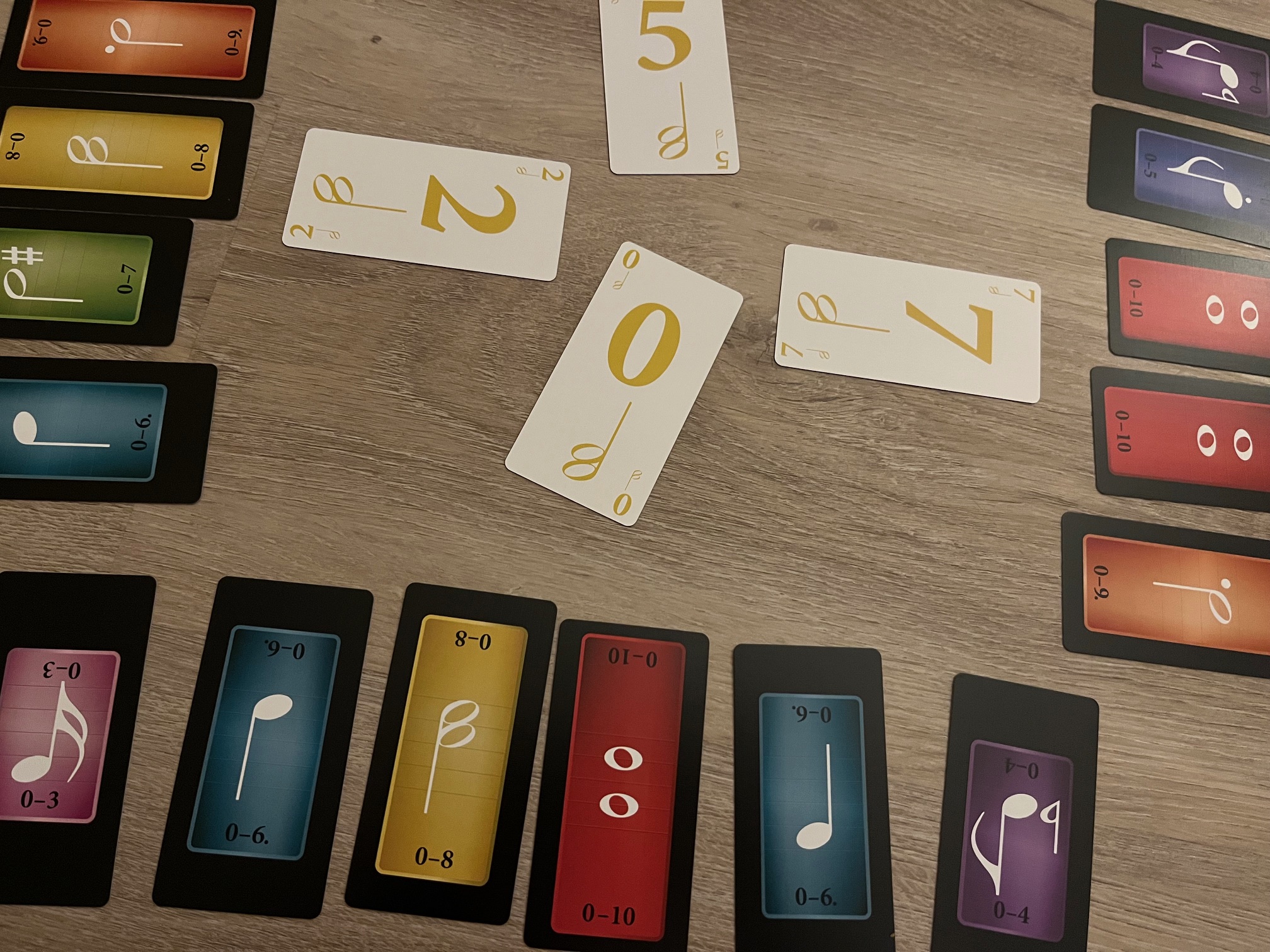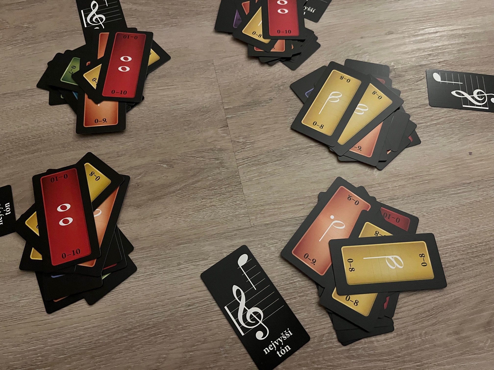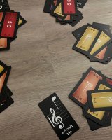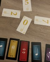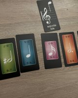 Po otevření na vás čeká 65 karet, rozdělených mezi specifické přehledovky „nejvyšších tónů“ a k nim 8 barevných sad s počtem 4 až 11 karet, stylizovaných tvarem i stylem do skutečných klávesových kláves. Každá sada obsahuje očíslované karty hodnot vždy od nuly až do specifické hodny (každé číslo je v sadě jen jednou). Styl karet je možná jednoduchý, ale osobně se mi líbí jejich tematické obdélníkové ztvárnění a styl s notami na rubu.