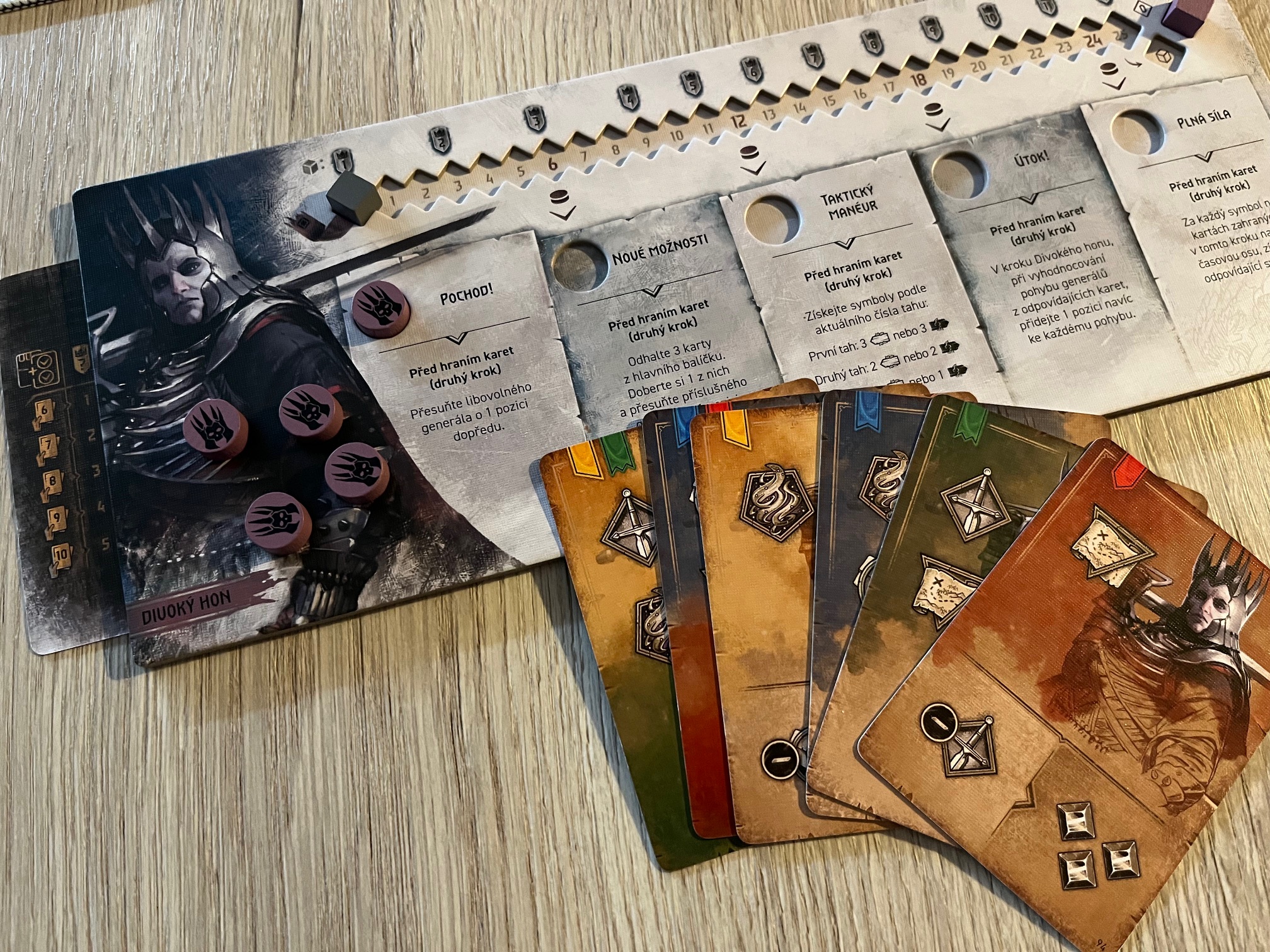 Hráč za Divoký hon má kromě draftování a skládání karet pro dominantní symboly k dispozici ještě speciální desku generálů, kteří postupují po jednotlivých stupnicích v závislosti na barvách karet a využívají tak své temné schopnosti proti hráčům. Naopak hrdinové se snaží zamezit postupu generálů a oslabit je. Je to taková vyvažovací přetahovaná a balanc mezi tím, kde zatlačit na postup, a kde můžete ubrat. Generálové totiž nejen disponují svými schopnostmi, ale také mohou sbírat pro svého „krále“ vítězné body, které jednoduše soupeři darovat nechcete.