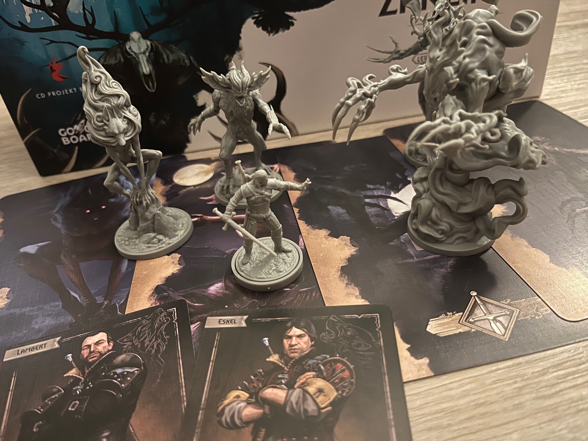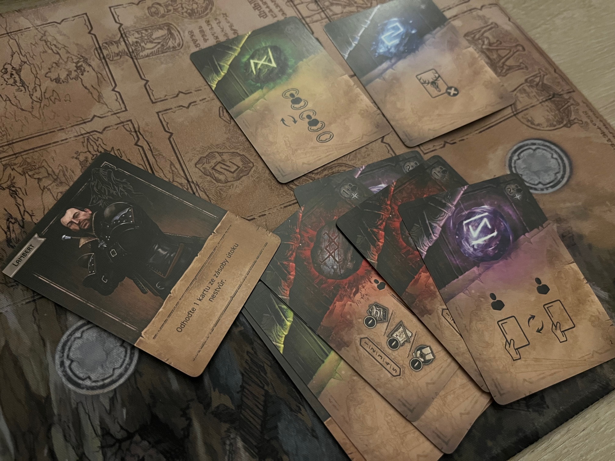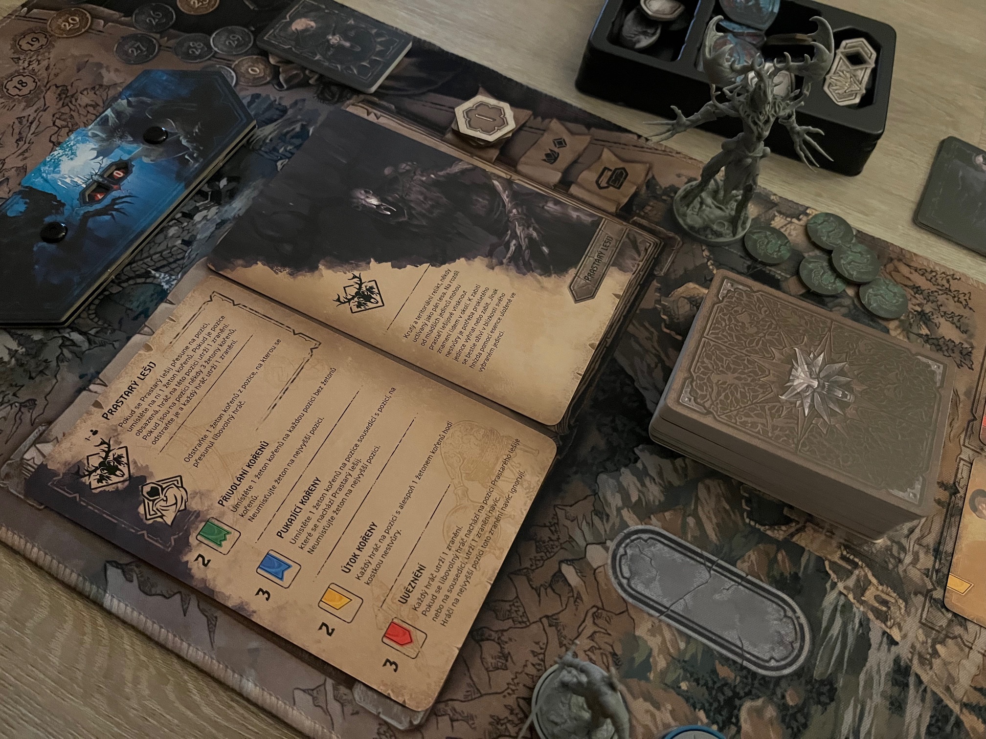 Kromě toho najdete v krabici namísto klasického příběhu 8 velkých karet nestvůr, které přinášejí různé schopnosti či útoky, tak aby žádná z nestvůr nebyla stejná. K tomu je zde sada karet pohybu, speciální karty stopování, které slouží jako osobní úkoly hráčů pro jednotlivé kapitoly, ale i speciální žetony zdraví a schopností nestvůr, stejně jako kostka a počítadlo. A také karty runových kamenů, které hráčům usnadňují snahu či speciální společníci v podobě Lamberta a Eskela, které lze využít pro pomoc. Ostatně více zaklínačů se na lov vždy hodí, ne?