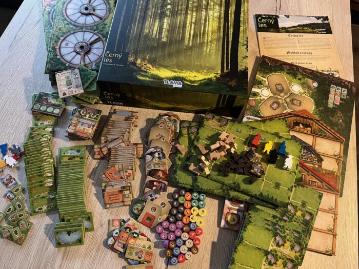 Černý les je hra bohatá a plná obsahu. Všemu dominuje velký herní plán zobrazující černý les a jednotlivé vesnice, kterými hráči během hry procházejí a navštěvují místní řemeslníky, kteří se však mohou (a budou) během hry měnit. K němu musíte připočítat trojici desek budov tvořících herní nabídku, desky statků, ale i produkční desky pro hráče s kolovým rondelovým systémem, který slouží jak pro produkci, tak i jako počítadlo surovin pro každého hráče.