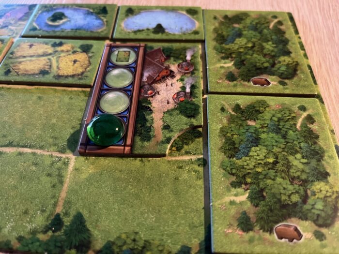 Druhým výrazným prvkem spojujícím hratelnost i téma je budování statků a hutí. Černý les je plný menších či větších usedlostí a vesniček, které postupně vznikaly kolem sklářských hutí přesouvajících se krajinou. Ve hře je tento prvek reprezentován hutí hráčů, která začíná na první desce statku, ale splněním podmínek se postupně přesouvá a zároveň tak rozšiřuje možnosti a prostor jednotlivých hráčů pro prvky jako budovy či krajinu. To je za mě strašně hezké a dává celkově prostor velké strategii.