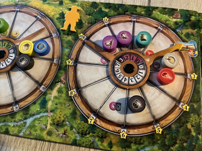Mechanicky je Černý les jedna z nejzajímavějších her, kterou jsem za poslední dobu mohl hrát. Než se dostanu k samotnému základu pravidel (který je mimochodem více méně velmi jednoduchý), musím vypíchnout trojici prvků. Prvním z nich jsou produkční kola. Ta jsou jádrem celé hry a fungují nejen herně funkčně, ale i tematicky. Každý hráč má na své desce dvě kola rozdělaná na základní a zpracované suroviny. Zatímco základní lze bez problémů získávat ve hře, zpracované mají zcela jiný režim doslova je hráčům herní systém „vyprodukuje“. Ve chvíli kdy hráč má více než jeden základní zdroj od každého typu a méně než tři zpracované, automaticky dojde k pootočení kola a zisku lepších zpracovaných a faktickému ztrátě obyčejných základních. Chápu, že to takhle zní dost kostrbatě, ale je to herně nesmírně funkční – trackování, skladování, počítaní, skvěle zpracovaná výroba – ale i tematické, protože jste skláři, a ve chvíli, kdy máte dost uhlí, dřeva, písku a vody, prostě vyprodukujete další sklo nebo naopak z kaše, masa a uhlí zase zboží a proviant. Kola navíc neslouží jen k tomuto, ale určují i konec hry. S celým systém se musí velmi šikovně a takticky pracovat a pro mě osobně se jedná herně o geniální prvek vycházející z Uweho předešlé hry Glass Road.