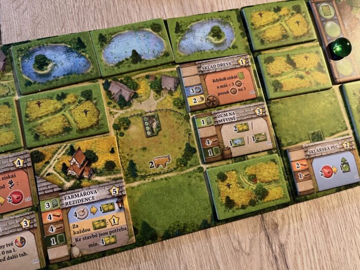 Příprava hry je trochu delší. Asi nejdelší je seskládání nabídky budov, protože musíte vybrat a složit 40 destiček na přesně daná místa a některé ještě otočit na speciální stranu. K tomu vyskládat nabídku žetonů lesů, krajiny, zakázek a řemeslníky na herní plán. Není toho zdaleka málo. A k tomu si musí každý hráč připravit produkční desky s žetony surovin, ale i statek s vyskládáním žetonů hutě, lesů či krajiny. Ano, skutečně počítejte pěkných pár minut na setup celé hry.