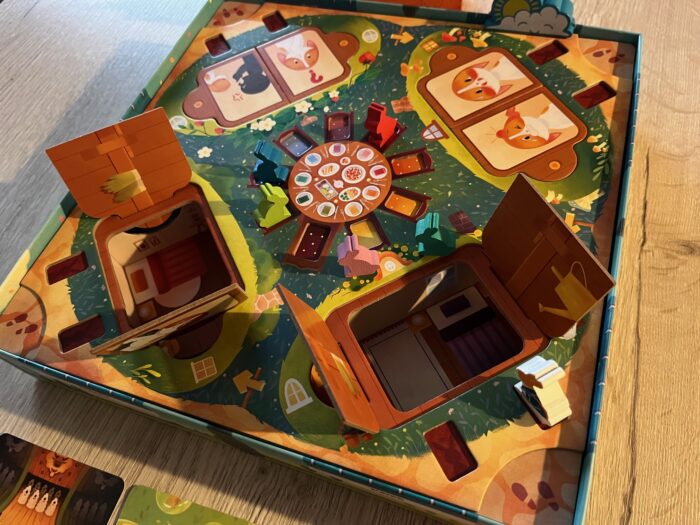 Podstatnou součástí hry je tady i krabice. Ne, neslouží jen na přenášení a ukládání, ale jako nosný herní prvek fungující jako počítadlo kol, ale i základ dvouvrstvé herní desky s norami králíčků zároveň. A k tomu i jako insert. Takže ano, jednoduše musím říct, že tady je box na hru zpracován v podstatě k dokonalosti. kromě toho najdete pod víkem ještě 8 dřevěných barevných králíčků a jednoho poštmistra a také 32 dílků dveří s různými ilustracemi vyjadřujícími zejména nálady obyvatel.
