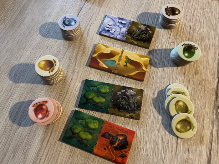 Pokud jste už hráli domino nebo dokonce jinou hru ze série Kingdomino, budete jako doma. Centrem hry jsou velké, pevné dominové dílky (28 + 4 startovní) rozdělené na dvě poloviny, zobrazující buď dva typy krajiny, nebo jeden stejný, přičemž se jedná o hory, lesy, zmrzlé pláně nebo třeba pouště. Ke každé barvě se pak řadí sada vajíček (69 celkem), kdy část z nich je prázdná (bez bodu) a část plná (s draky). A to je v zásadě vše, kromě dřevěné figurky draka pro prvního hráče a k tomu pravidla, která mají jen pár stránek a přehledných mechanik.