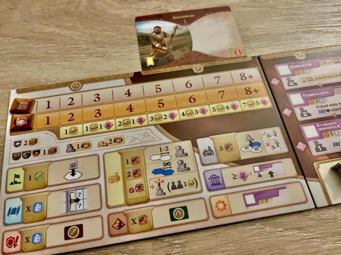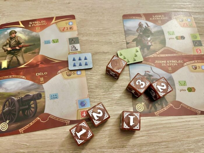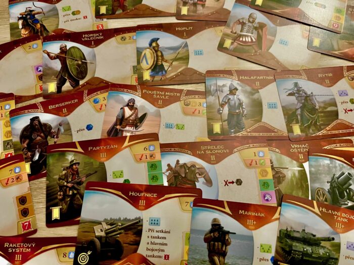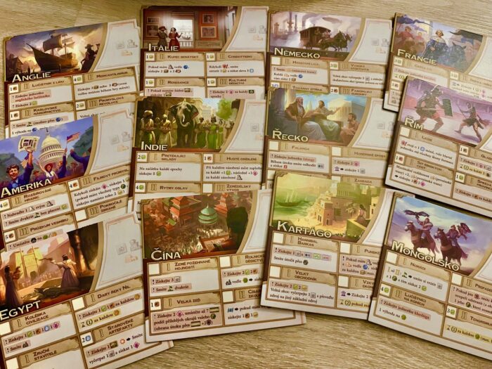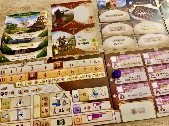 A když už jsem u civilizací – ve hře najdete v základní krabici celých 12 národů, které mají svá specifika a schopnosti, které je vzájemně odlišují a propíjí do hry typické atributy té či oné strany, ať už jsou to mongolští kočovníci, angličtí mořeplavci či římské legie a řecká filozofie. Odlišnost civilizací je sice dána jejich schopnost, ale musím trochu smutně poznamenat, že během hraní hra neklade na civilizace větší důraz a v zásadě je vám jedno, kdo za koho hraje. Kromě zvolené civilizace je pro každého z hráčů připravena hromada herního materiálu, kterému dominuje dřevo na jedné a papír na druhé straně. Sympaticky žádný plast, žádné figurky. To však dělá herní materiál trochu abstraktním, kdy hodně věcí je řešeno označením barevnými kostičkami. Nevadí mi to, ale mezi mými spoluhráči to na počátku vyvolalo trochu zklamání. Kromě kostiček je pro každého hráče připravena řada herních desek (obchodování, vlády, pomocná deska), karet (počáteční jednotky, vynálezy, obchod), ale také zmíněné dřevěné žetony, jako jsou města, obchodní stanice či ukazatele. Hodně tematicky a mechanicky zajímavou volbou je ukazatel diplomatického statusu spolu s vlajkami vyhlášení války, které jasně deklarují kdo s kým je v míru, válce nebo kdo je tzv. válečným štváčem, který se žene válečnou štěstěnou.