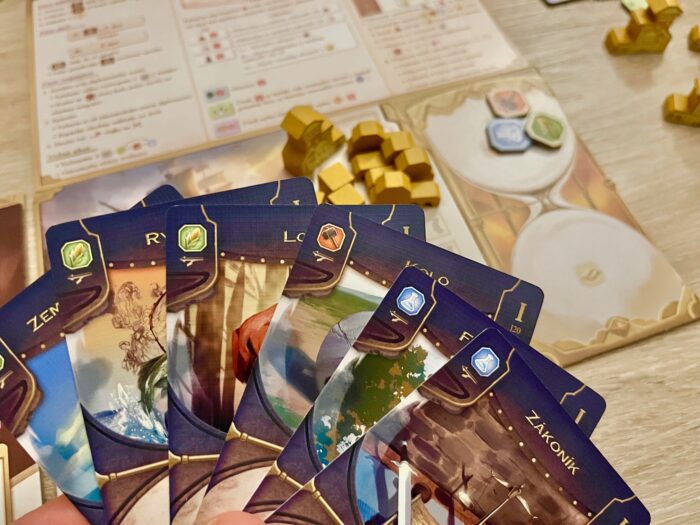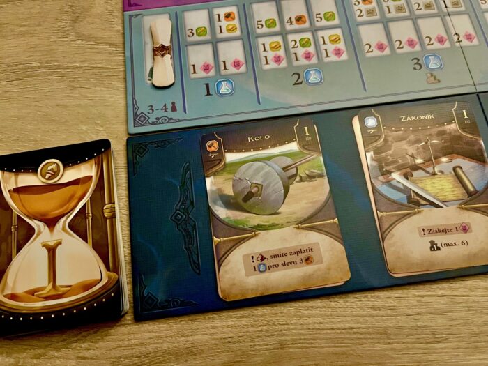 Ano, pod víkem Epoch se toho jednoduše řečeno skrývá hodně. A z toho plynou dvě věci – jednak příprava hry rozhodně není okamžikem několika málo minut, ať už té společné části či jednotlivých hráčů. Než prostě všechno vyskládáte, trvá to a chce to opravdu jít v poklidu krok po kroku. A zároveň je třeba si hru vyhradit dostatek herního prostoru. Ve dvou to ještě jde, ale v plném počtu to chce opravdu velký stůl a nebál bych se Epochy srovnávat rozměry třeba s megalomanským Speakeasy. Z toho pro mě plyne z hlediska zpracování jedna menší nevýhoda, a to je poměrně malý font textu, kdy se třeba na karty v nabídce, pokud jsou od vás dál, častěji nakláníte, abyste měli přehled. A zároveň každý prostor hráče složený z několika částí je hodně obsáhlý a široký a chce to si na vše postupně zvyknout, což sebou nese rozhodně pomalejší úvod prvních partií.
