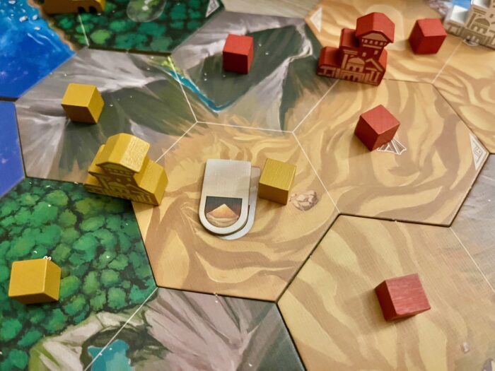 První mini hrou ve hře je zmiňovaný setup – mapa, zásoby žetonů, nabídky karet, do toho osobní prostory hráče. Puf a máte slabších 20-30 min pryč.
