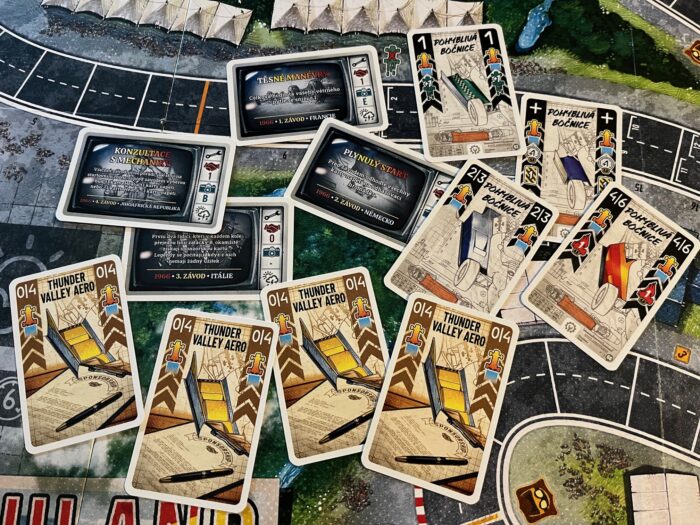 Možná největší novinka, která má přímý dopad do hry a na taktiku je přídavný větrný pytel. Ten nenahrazuje základní mechanismus, ale přidává další možnost posunu pomocí karet vylepšení a sponzorů. Tento efekt funguje tak, že pokud pomocí klasického větrného pytle skončíte za nebo vedle dalšího auta a máte na kartách příslušný symbol, můžete skočit dál. Navíc můžete efekt řetězit, takže klidně přeskáčete při vhodné konstelaci 2-3 soupeře (což je asi maximu, které se mi povedlo). A jo, je to super!