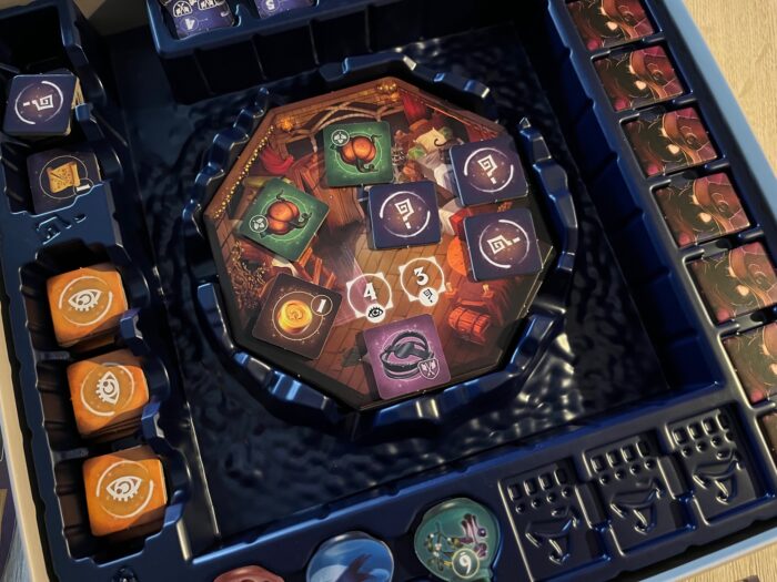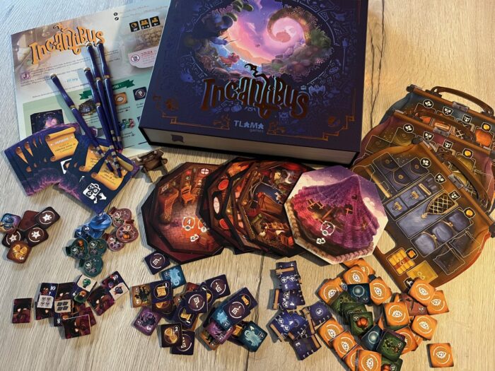Zpracování hry je bomba. Incantibus je poměrně levná deskavka, která ovšem doslova každou korunu odráží ve svém zpracování od kvalitních a pěkně zpracovaných žetonů, přes povedený pevný insert nebo magnetické uzavírání boxu, který vypadá jako kniha. Líbí se mi i šikovný a chytrý systém věže s postupným odhalováním a takové detaily jako kočka podpírající víko.