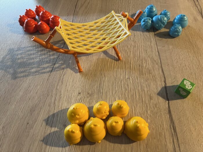 Jednoduše! Doprostřed stolu postavíte houpací síť a každý si vezme jednu sadu křečků. První hráč k tomu dostane kostku.