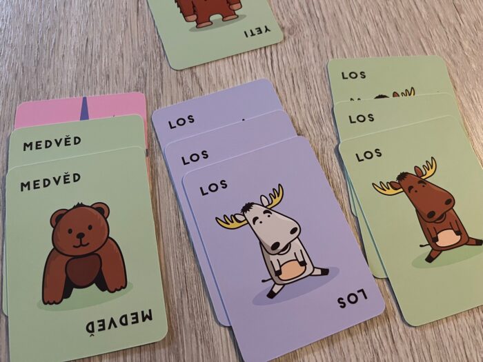 Celá hra se skládá přesně z jednoho plastového žetonu s losem (a losím zadkem) a 93 karet, rozdělených mezi trojici zvířat v podobě losů, medvědů a veverek vždy ve dvou barvách hnědé a bílé a s povedenými ilustracemi navazujícími třeba na zmíněné Taco, kočku… Kromě zvířat obsahuje balíček karet ještě speciální škodící laviny, yettie a naopak pozitivní žolíkové lesy.