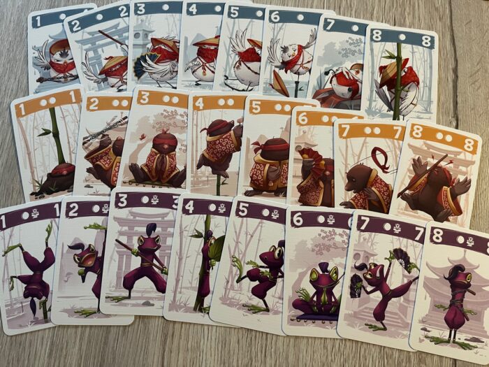 Obsah hry se sestává z trestných žetonů o trojici hodnot od 1 do 3, dle kola, ve kterém se rozdávají, figurky mistra Makatsu pro prvního hráče a k tomu pravidla. Tím hlavním je ale skoro 150 karet rozdělených do 6 stejných balíčků rozlišených dle barevných rubů pro každou školu jeden. Každý balíček se skládá z 24 karet trojice barev o hodnotách 1 až 8, kdy na každé sadě je tematicky jedno ze zvířat – krtek, jeřáb, ještěrka v řekněme různých pozicích snahy o přesvědčení mistra.