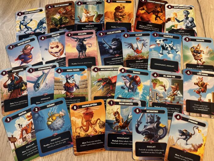 Monstra jsou extrémně vtipným (pokud jako my holdujete podobnému humoru) mixem šíleností jako Pilabuď, Pichlavý nindža nebo nebo třeba Jedortík. Ne, tady se nehraje na jakoukoliv vážnost nebo serióznost. Každá karta monstra má určitou sílu a schopnost či schopnosti, a to ať už aktivní či pasivní. Hra celkově těží z několika lehce zapamatovatelných klíčkových slov, ale v případě edice Za hranice evoluce i z řady popsaných schopností v podově pasivních či aktivních akcí, ale i samotné evoluce karet, které jsou zásadní novinkou. Evoluční jsou zde čtyři karty, které může hráč postupně pomocí nového klíčového slova akce vyvíjet z prvního až po ultimátní třetí level. A nemyslím si, že je dobré ponechat soupeři možnost dojít do třetího stupně žádné z těchto karet, protože jejich síla, to už je hodně solidní divočina.