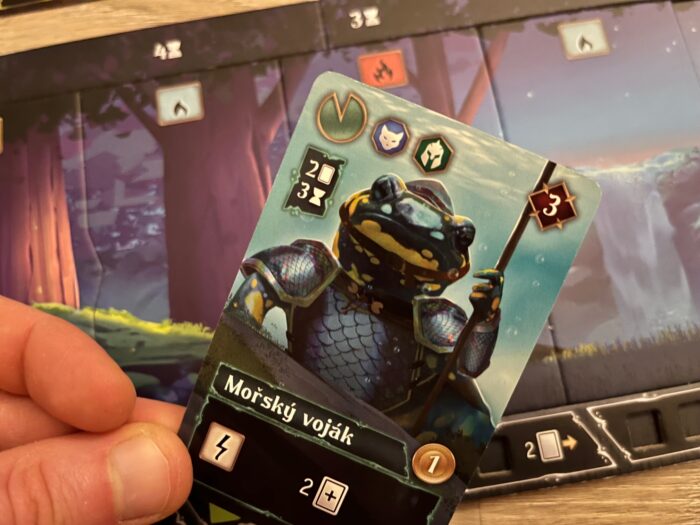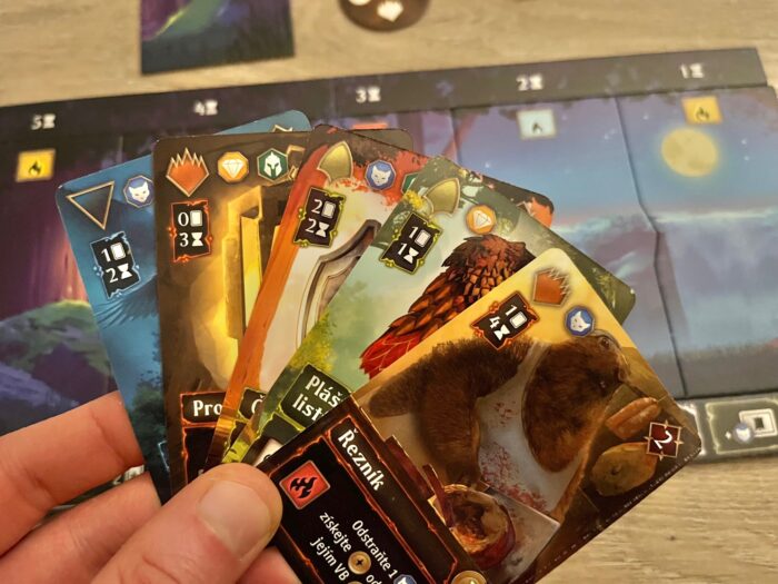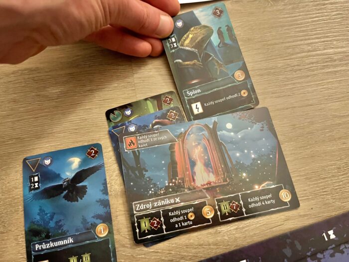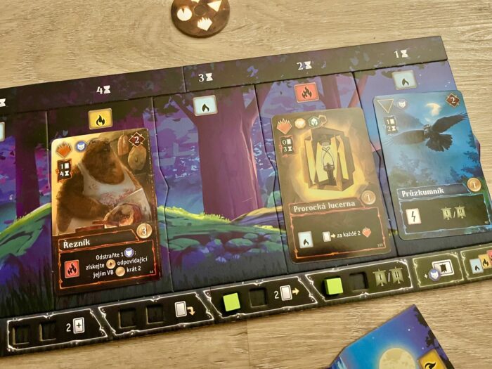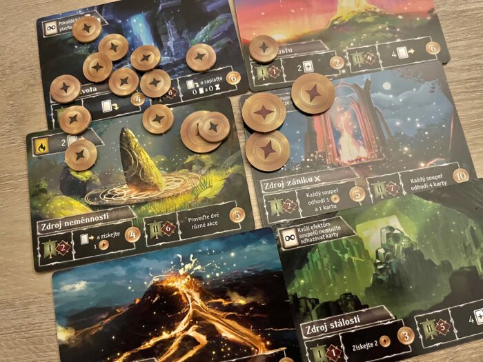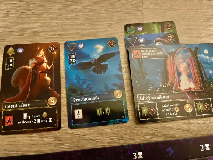 Hra se dělí na kola a ta na trojici fází. V první části dochází k plynutí času. Jak už jsem zmínil výše, karty hráči nehrají přímo, ale na svou desku, která se postupně posouvá každým kolem (jeden dílek je vždy mimo a čas doslova plyne) a karty se tak přibližují svému využití. Jakmile všichni hráči postupně vyřeší posun času, doberou si kartu a nastává fáze akcí. V té mají všichni hráči k dispozici postupně 2 tahy, během kterých mohou vykonat jednu ze čtveřice akcí – dobrat si dvě karty, zahrát kartu, posunout dvě karty nebo dobýt/opevnit jeden zdroj. Dobrání karet je asi jasné. Zahrání karty znamená její vyložení na časovou osu a zaplacením příslušným odhozením karet z ruky. Posunutí karet je takovým zrychlením procesu. Nejkomplikovanější je asi akce dobytí/opevnění. Místa moci, nebo chcete-li zdrojů, jsou stěžejní a vytváří ve hře zajímavou dynamiku a soupeření. Každá karta zdroje má určitou sílu, kterou je třeba překonat pomocí síly svých karet bytostí – má zdroj sedmičku? Musíte z bytostí složit sílu 8 apod. Karty pak položíte po zdroj jako pomyslnou obranu. A máte dobytu. Druhým prvkem je pak opevnění, protože pouze dobytou kartou může získat některý ze soupeřů a je třeba zdroj opevnit. Tedy tak trochu zvýšit sílu družiny na zdroji a překonat tak jeho hodnotu pro dobytí. Kromě standardních akcí lze využít i dvojici volných, kdy jedna slouží na posílené karet u zdroje, druhá na aktivaci tzv. plamene, což je schopnost některých karet.