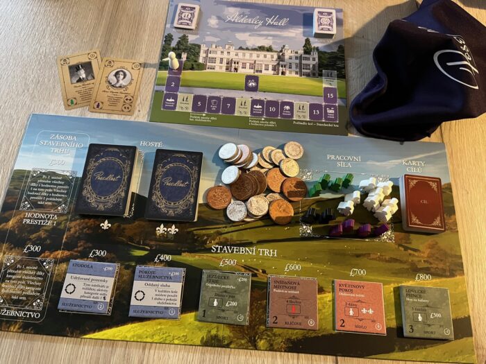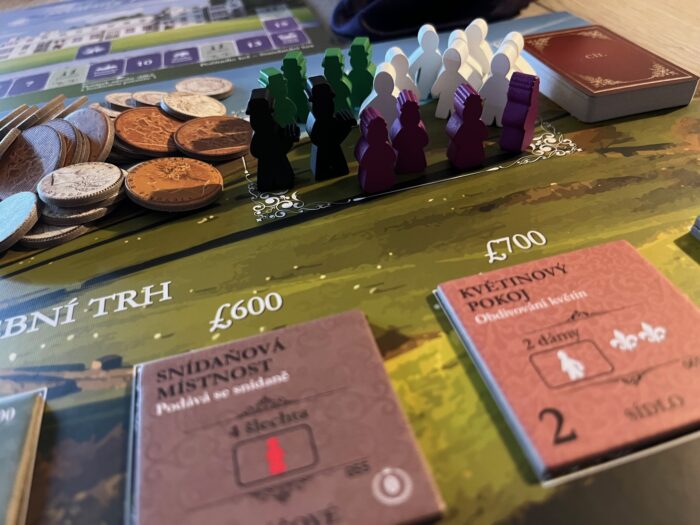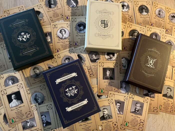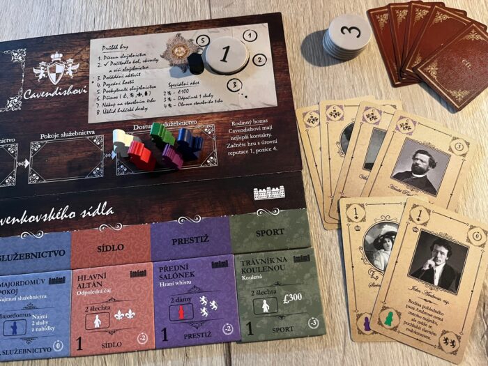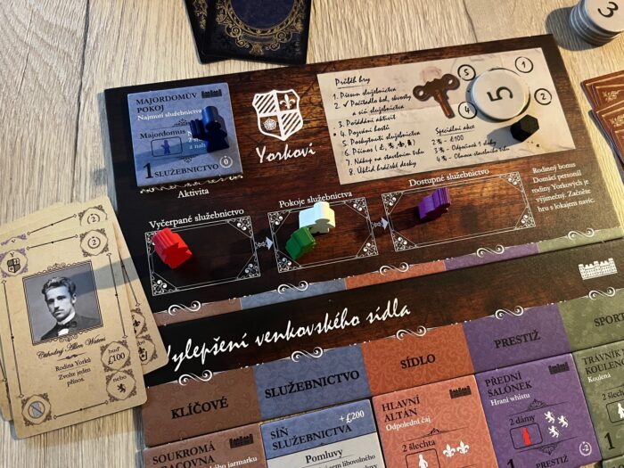 Komponentově je hra velmi obsáhlá – od velkých společných desek zásob a kol, přes desky pro hráče a hromadu dílků vylepšení představujících jednotlivé prvky a místnosti usedlostí, až po desítky karet, žetonů a dřevěných figurek služebnictva v šestici barev a tvarů. Co musím zmínit, to jsou karty rodiny a hostů – tohle je totiž absolutní paráda. Ne snad jen kvůli přehlednosti nebo herní funkčnosti, ale hlavně kvůli zpracování, kdy každá karta obsahuje černobílou fotografii skutečné postavy s reálným jménem a tematickým popiskem, což hře strašně přidává na atmosféře a tématu, což je ostatně jedna z největších předností hry. A také musím zmínit speciální karty zaměření a vítězných bodů, protože to jsou asi ty nejmenší kartičky, které jsem kdy ve hře viděl – menší než mini formát, spíš takové micro dílky.