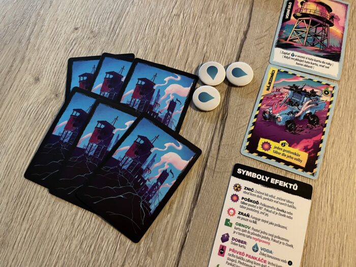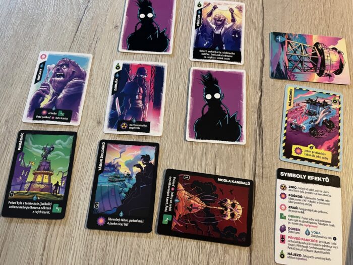 Ano, menší papírová krabička s křiklavou grafikou Mannyho Trembla obsahuje jen a pouze 42 karet táborů a samolepky pravidel. To je mimochodem super řešení – žádný malý sešítek, který někde ztratíte, ale samolepky nalepíte na poslední stranu původních pravidel, případně pokud máte starší původní verzi pravidel, upravíte si dvě věci uvnitř pravidel menšími přelepkami. No a 42 karet je rozdělených mezi 32 karet zcela nových a 10 upravených, které nahrazují ty z původní hry. Ano, připravte se opět na šíleně barevnou grafiku plnou postapokalyptické atmosféry, barevných detailů, křiklavých linek a surovosti. Rozhodně se nejedná o hru pro každého, ale fanoušky komiksového barevného stylu potěší na maximum a skvěle zapadne do původní hry. Navíc rozšíření bez větších problémů uložíte do původní krabičky, a to i s obalenými kartami. Jen samozřejmě v boxu nemáme původní insert.