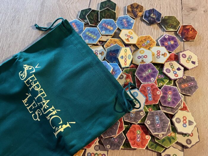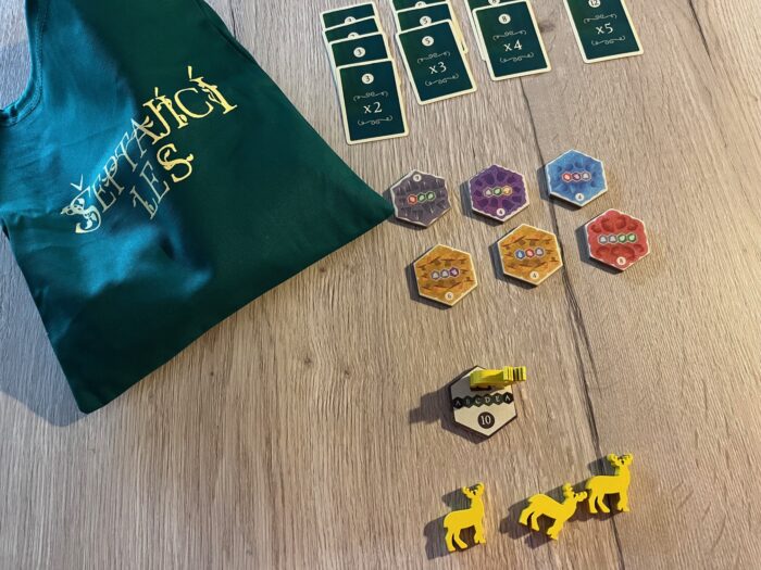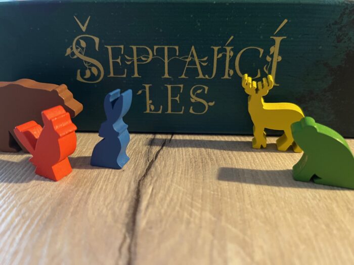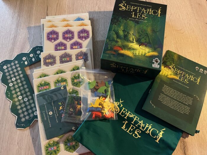 Magickou atmosféru přináší Šeptající les už prvním pohledem na krabici, kterou – stejně jako celou hru – zdobí ilustrace Weberson Santiago. Jeho výtvarný projev a ztvárnění je velmi hezké, byť nejvíc vyniká právě na krabici a v pravidlech, herní materiál už je o poznání více abstraktní, zejména pak šestihranné dílky, kterých je celkem 100 oboustranných pro klasickou hru a 4 speciální pro sólo. Sice se dočtete, že každý dílek reprezentuje dle své barvy jeden element/přírodninu, ale spíše vnímáte jen barvy. Byť je hře třeba přiznat, že symboly pomohou s jejím hraním i hráčům se sníženým či omezeným barvocitem. Poslední poznámka k dílkům – takhle tlustý kartón se jen tak nevidí. Z tohohle by se mohly řezat trojvrstvé desky. Kromě dílků najdete v krabici krásný látkový pytlík na losování, speciální karty a povedené dřevěné meeply ve tvarech čtyř zvířecích druhů – žab, jelenů, zajíců a ptáčků kardinálů (doufám, že jsem druhy identifikoval správně).