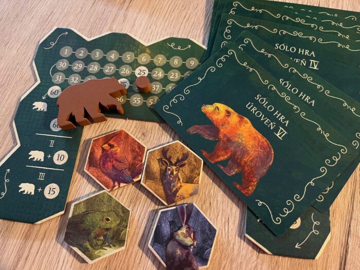 Samostatnou kapitolou je pak vybavení pro sólo hru, protože to používá zvláštní herní materiál jako speciální desku, medvědí figurku (ta jinak slouží jako žeton prvního hráče), ale i karty výzev a zvláštní čtveřici dílků pro označení.