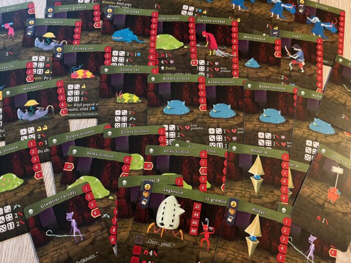 Ze zpracování hry a jejího uložení by se mohla leckterá hra učit. Vše pod víkem najdete rozložené v perfektně připraveném insertu, kde má všechno své místo a přihrádku, ať už hru ukládáte po celé partii nebo třeba mezi jednotlivými kapitolami, protože nemáte dostatek času na celou hru. Herní materiál z vybavení pro jednotlivé hrdiny v podobě čtveřice figurek, desky, a hracích karet mnoha typů – od základního balíčku, přes různé odměny a vylepšení, kdy doslova každá postava má své vlastní vybavení přispívající k její odlišnosti. A považte, že takových herních karet je dohromady skoro 400! Kromě toho najdete ale najdete v krabici i další karty, další hromadu karet jako jsou nepřátelé několika úrovní, bossové, události, stavy či různé vybavení, relikvie nebo lektvary. Ano, hra je primárně o kartách, kterých je jednoduše řečeno HODNĚ. A to ani nemluvím o skrytém obsahu, který si odemknete postupným hraním. A aby toho nebylo málo, najdete tu i navíc desky, herní plán, více než 100 žetonů a celých 450 speciálních potištěných obalů s logem hry. Inu hra sice není levná, ale výměnou je porce herního materiálu, který by jinde vyšel i dvě až tři průměrné velké hry.