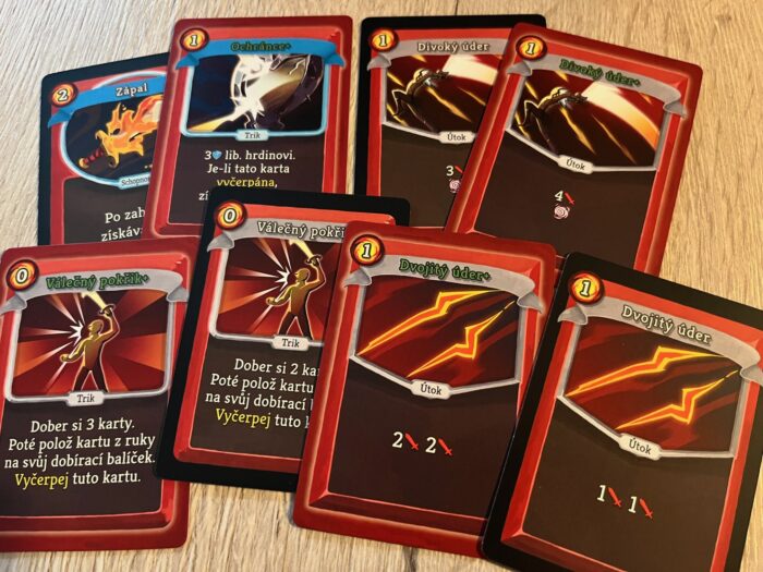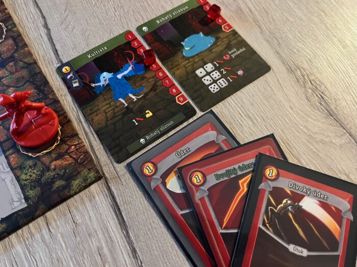 Když bych měl uvést nějaký ten příklad herního kola, vezmeme si třeba Železňáka v sólo variantě. Ten na herním plánu vstupuje na pole nepřátel. Z balíčku je mu přiřazen nepřítel v podobě barevného kousavého červa, který je možná úsměvný, ale jeho ostrá zubiska umí potrápit. Železňák bere na začátek do ruky 5 karet ze svého balíčku a snaží se jejich kombinací a hraním za energii skolit soupeře. Po odehrání tahu hráče hraje automatický protivník, pak zase hráč, a to až do porážky jedné ze stran. V ideálním případě potvory, protože smrtí byť jen jediného hrdiny končí celá hra prohrou a neúspěchem. Během tahu může hráč navíc využívat nejen své herní karty, ale i různé relikvie či lektvary, zkrátka takové klasické RPG.