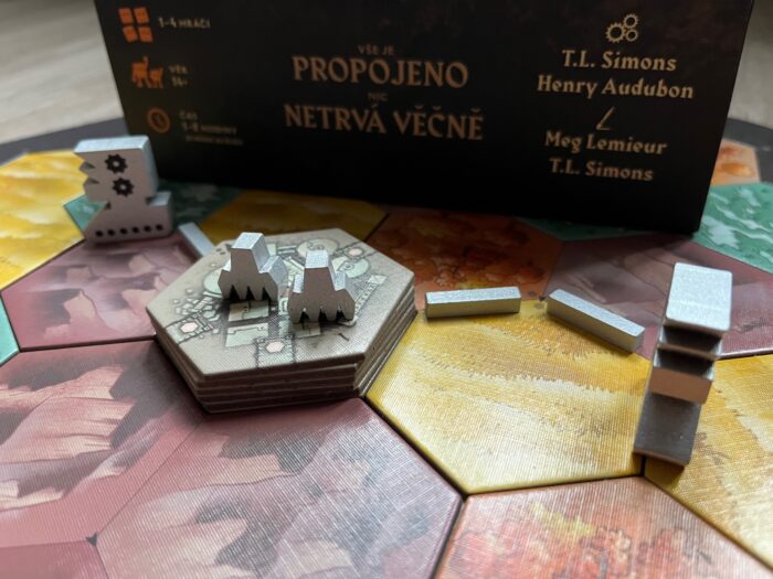 O ilustrace hry se postarala dvojice Meg Lemieur a T. L. Simonse, kteří hře vtiskli společně originální vizuální stránky, byť v ní vzdáleně můžete najít podobnost třeba s výše zmíněnými hrami. Příjemné je, že ve hře šel stranou jakýkoliv plast a vše je v kombinaci dřevěných figurek a kartonových dílků a žetonů a také karet, které celou hru řídí, ať už ze strany hráčů či automatického mechového protivníka. Komponent je dost a krabice, která nese menší čtvercové rozměry je jich pěkně plná. Můžete se těšit na vyloupání desítky žetonů, desek a destiček, skládací mapu z hexových dílků nebo kruhy (desky) pro jednotlivé frakce. A k tomu dřevěné sady nepřátel, ať už mechy, velké mašiny či zdi, kterými plní stroje mapu.